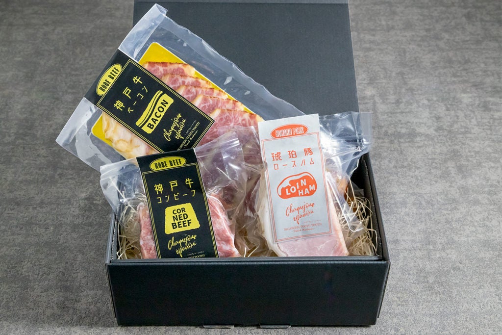 琥珀豚ロースハム(ブロック)・神戸牛コンビーフ・神戸牛ハレノヒベーコンの3種を、オリジナルギフトボックスに入れてお届けいたします。