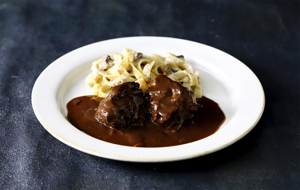 神戸牛のスネ肉を種類豊富な香味野菜とハーブと一緒に赤ワインに一晩漬け込み表面を香ばしく焼き上げるひと手間がポイント。肉のうまみが溶け込んだ赤ワインと香味野菜、さらにフォンドボーと特製デミグラスソースを合わせてじっくり煮込みました。存在感のある六甲シャンピニオンの旨味をぎゅっと凝縮したパスタソースと、食べ応えのあるタリアテッレ(麺)と合わせて是非お愉しみください。