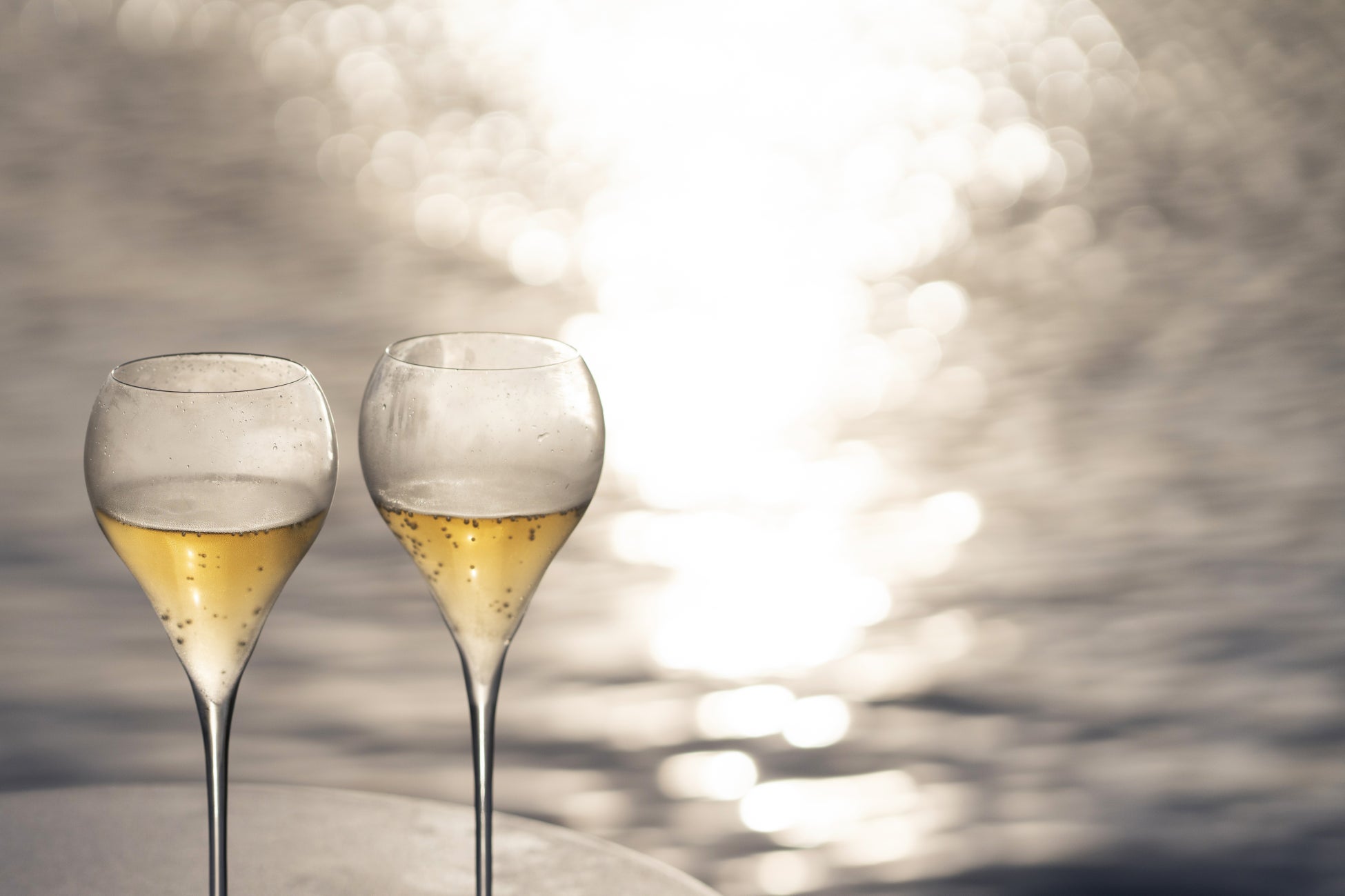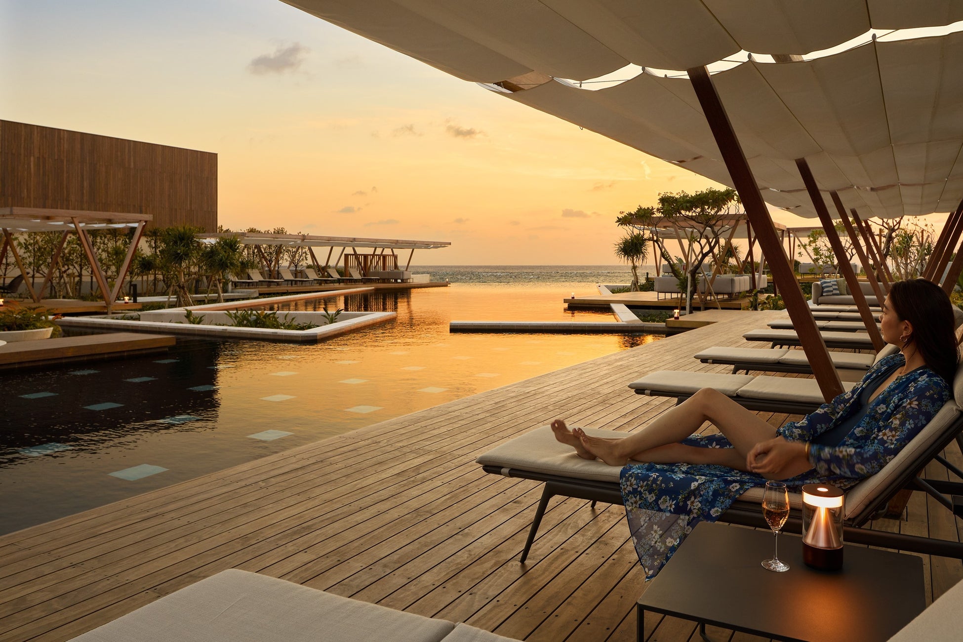 星のや沖縄のプールは、西海岸に面しており、水平線に沈む美しい夕陽を臨む特等席です。開放的なインフィニティプールは加温式で、冬でもあたたかく快適に過ごすことができます。凛とした冬の空気が深く澄みわたり、夕焼け空をいっそう鮮やかに描き出す色彩の中、海に沈む夕景を見ながらシャンパーニュを堪能。自然に包まれた空間で、ゆったりと過ごす大人のひとときです。