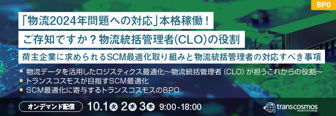【トランスコスモスオンラインセミナー】「物流2024年問題への対応」本格稼働!ご存知ですか?物流統括管理者(CLO)の役割を10/1(火)、10/2(水)、10/3(木)に開催