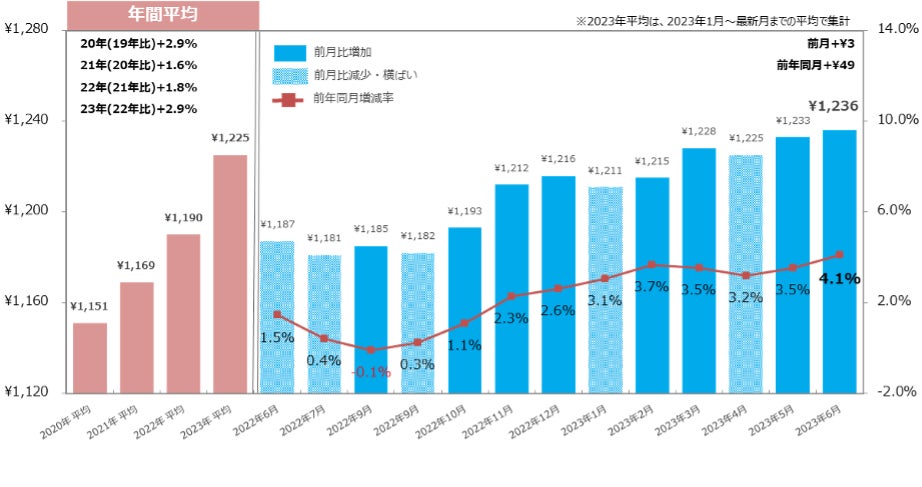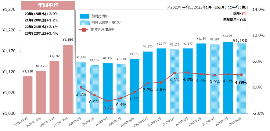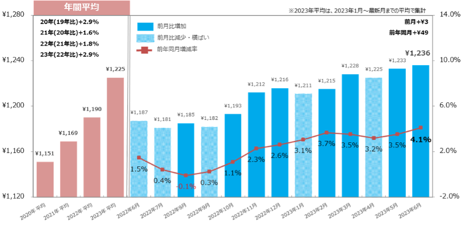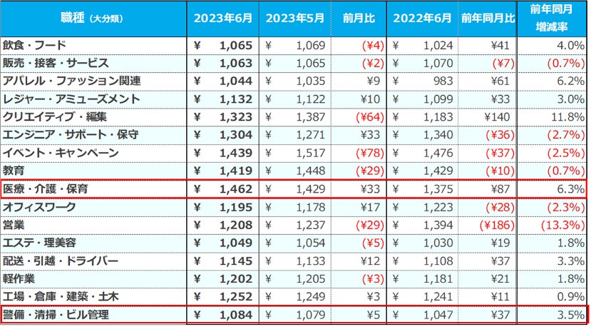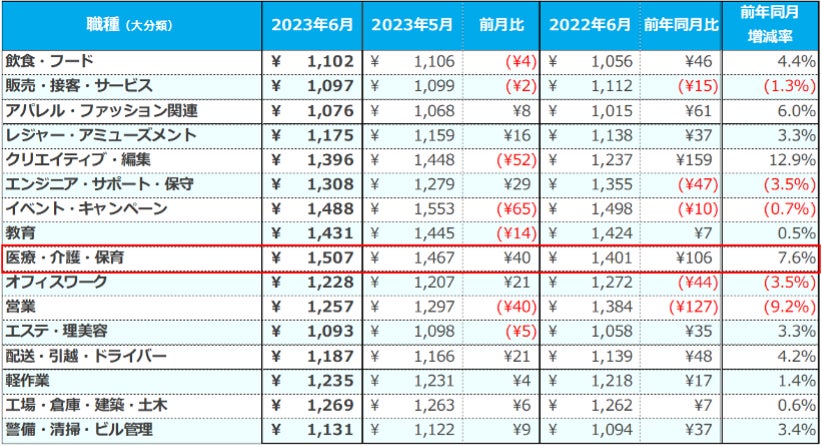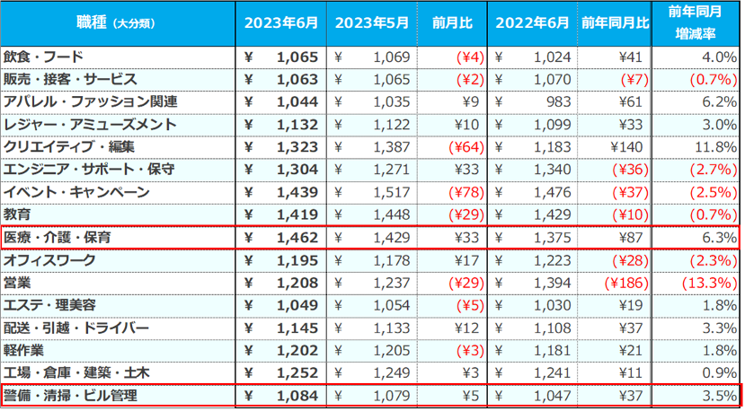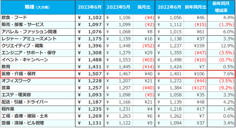 23年6月の全国平均時給は1,190円。[医療・介護・保育]は1,462円で2カ月連続で過去最高に。