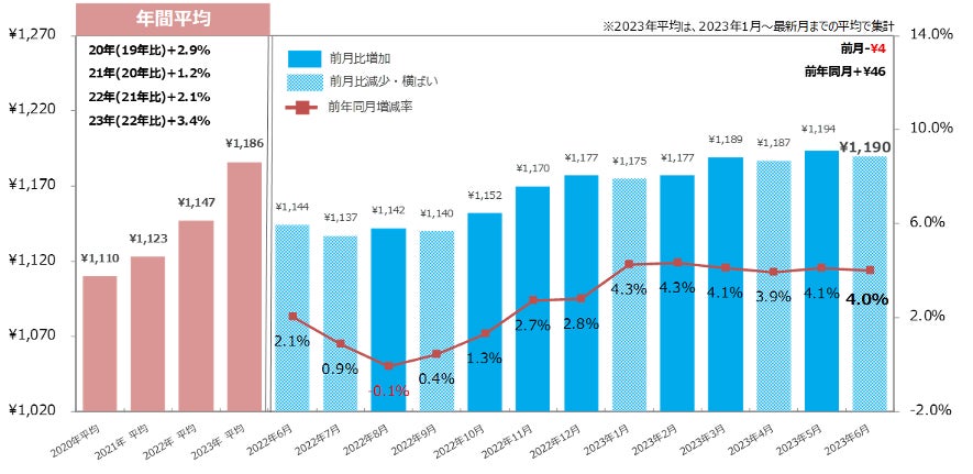 23年6月の全国平均時給は1,190円(前月比:-4円、前年同月比:+46円)となり、前年同月比は22年9月以降10カ月連続で増加。また、求人件数は前年同月比で1.2倍に増加した。