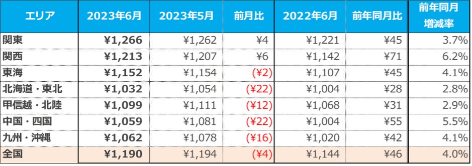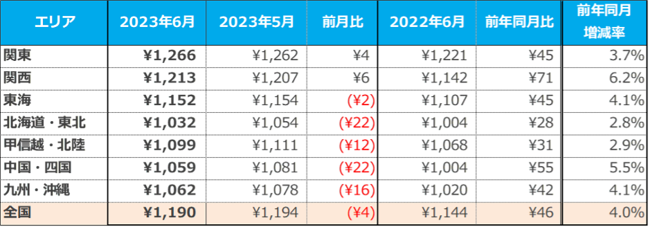 エリア別平均時給をみると、7エリア中「関東」「関西」の2エリアで前月比・前年同月比ともに増加となった。「関東」は1,266円(前月比:+4円、前年同月比:+45円)で、20年1月の調査開始以来 過去最高額となった。「関西」は1,213円(前月比:+6円、前年同月比:+71円)となり、23年2月以降5カ月連続で過去最高額を更新した。【図4】