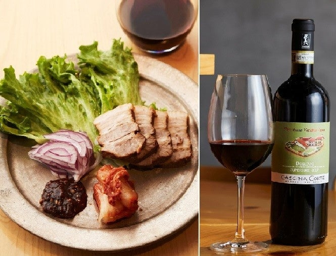 やさしい味わいの韓式料理×ナチュラルワインのペアリング。八角が香る茹で豚にキムチや味噌を添え、レタスで巻いて。料理に合わせやすく、懐の広いナチュラルワインの赤をチョイス。ほど良い酸味とすっきりとした後味は、韓式料理の上品な味わいにぴったり。
