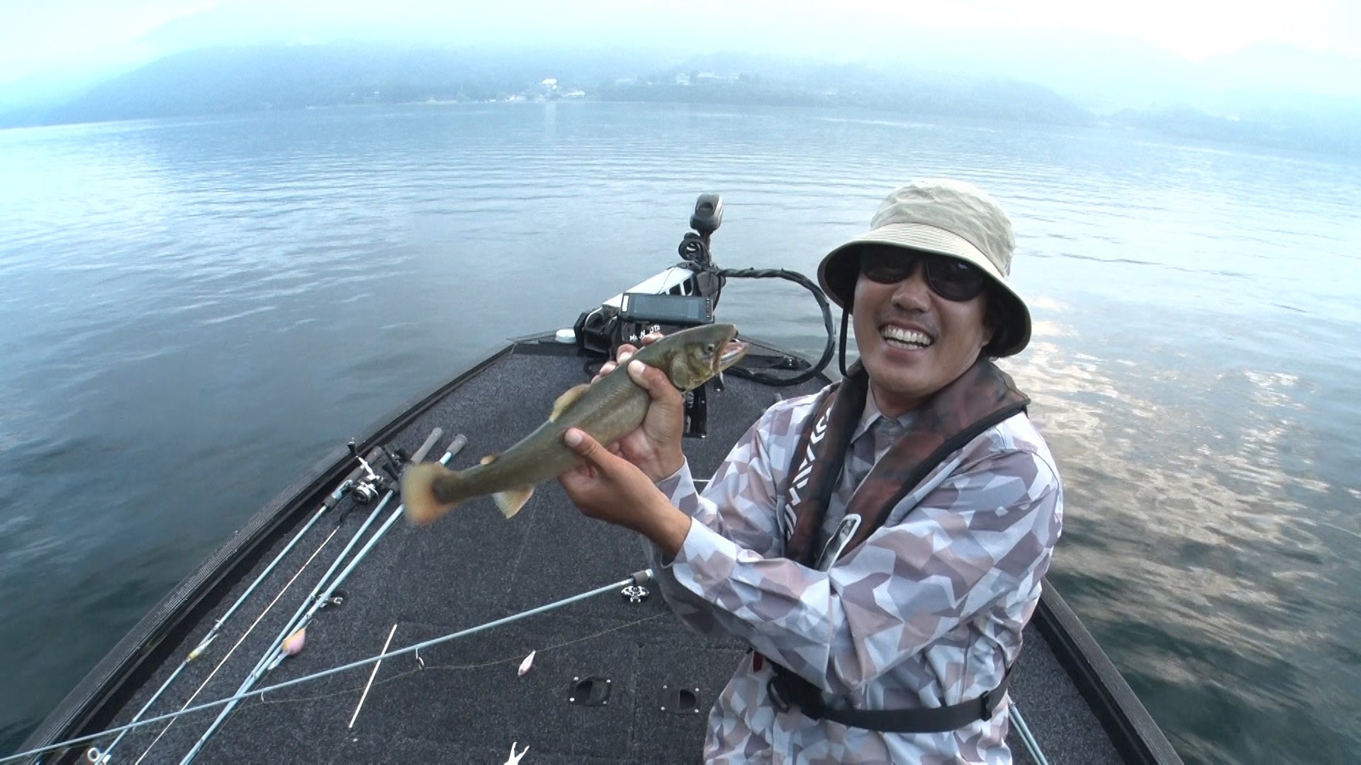 ポイントに到着すると、沖でボイルが!すぐさま、トップウォータープラグをキャスト!逃げ惑う小魚を演出する。すると、水面を割る豪快なバイト!ファイトの末上がってきたのは、40cmの大型イワナ。芦ノ湖ならではの嬉しいゲストだ。