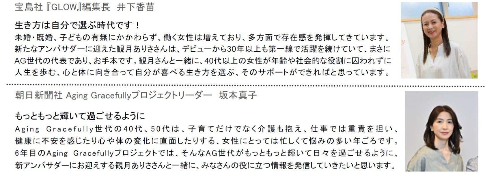 「Aging Gracefully」(以下、「AG」)とは“優雅に年を重ねる”という価値観を指し、女性の2人に1人が50歳以上といわれる現在の日本で、加齢に対する新しい価値観を広めていきたいという考えから2018年よりプロジェクトをスタートしました。今年で6年目を迎える2023年度は、10代の頃から第一線で活躍し、明るい笑顔と凜とした姿で、読者の憧れと共感を集める観月ありささんをアンバサダーとして起用します。そして『GLOW』は