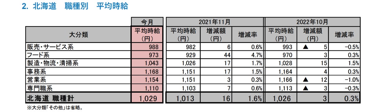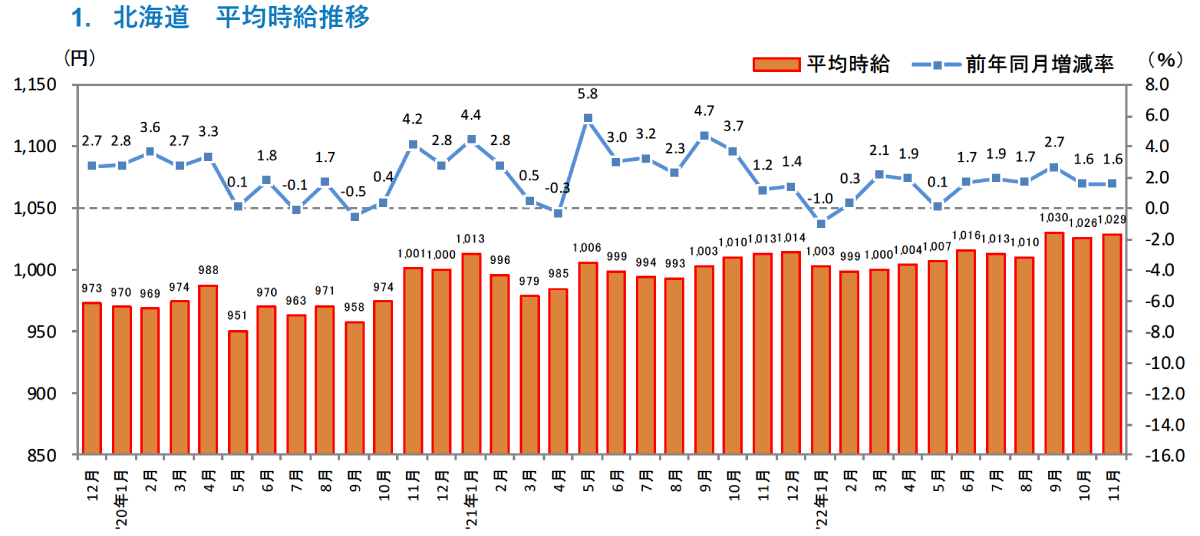 [北海道版]2022年11月度 アルバイト・パート募集時平均時給調査 北海道の11月度平均時給は前年同月より16円増加の1,029円