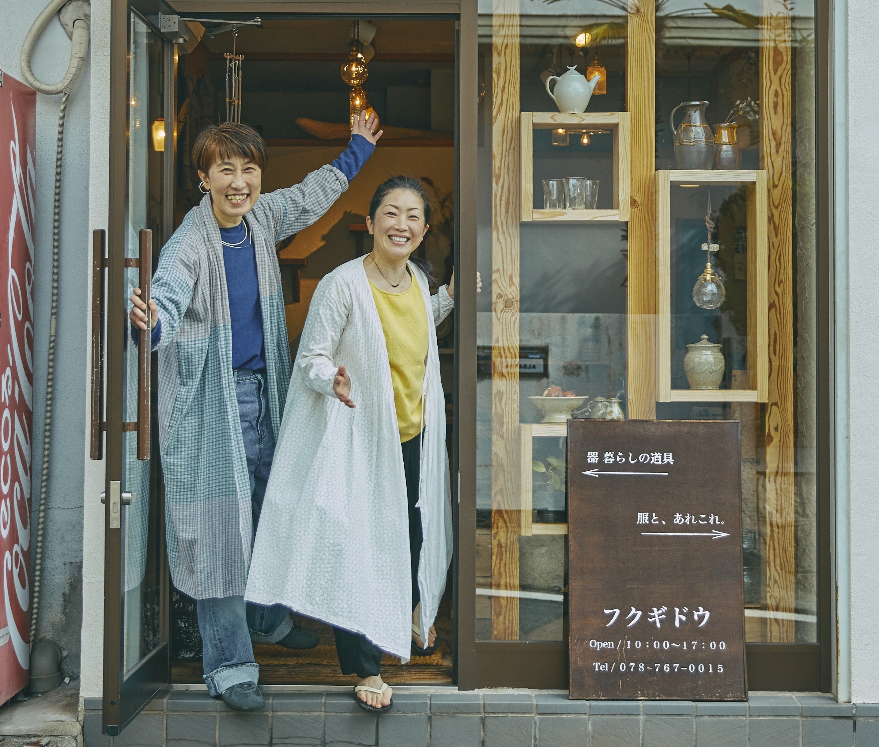 神戸・六甲の駅近くに並ぶ二軒のお店「器 暮らしの道具 フクギドウ」と「服と、あれこれ。フクギドウ」。オー