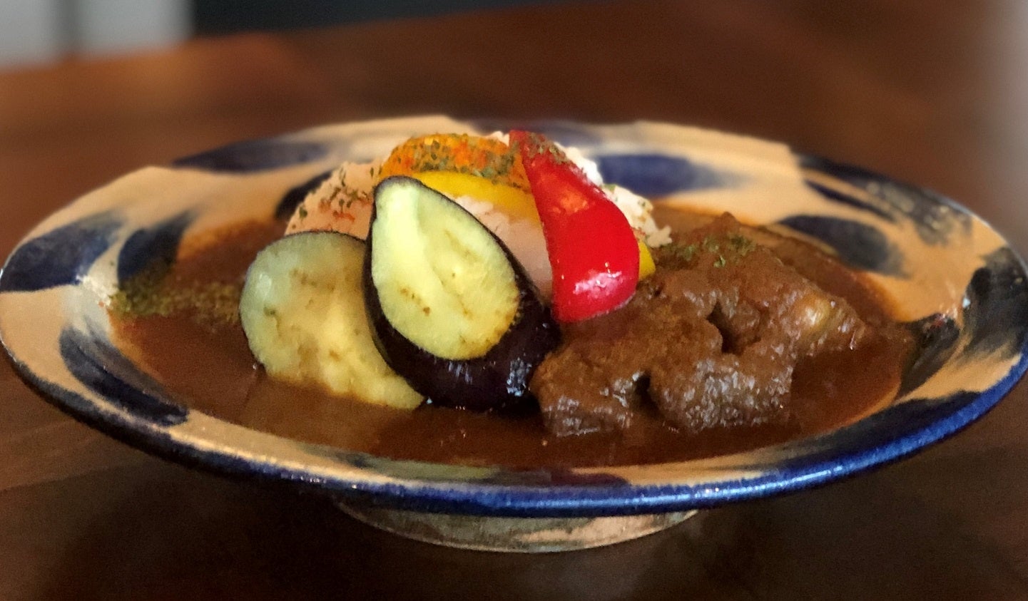 野菜の甘みが溶け込んだルーにゴロッと大きな牛肉を乗せたお店自慢のビーフカレーを、共司親方特製の器に入れてご提供します。