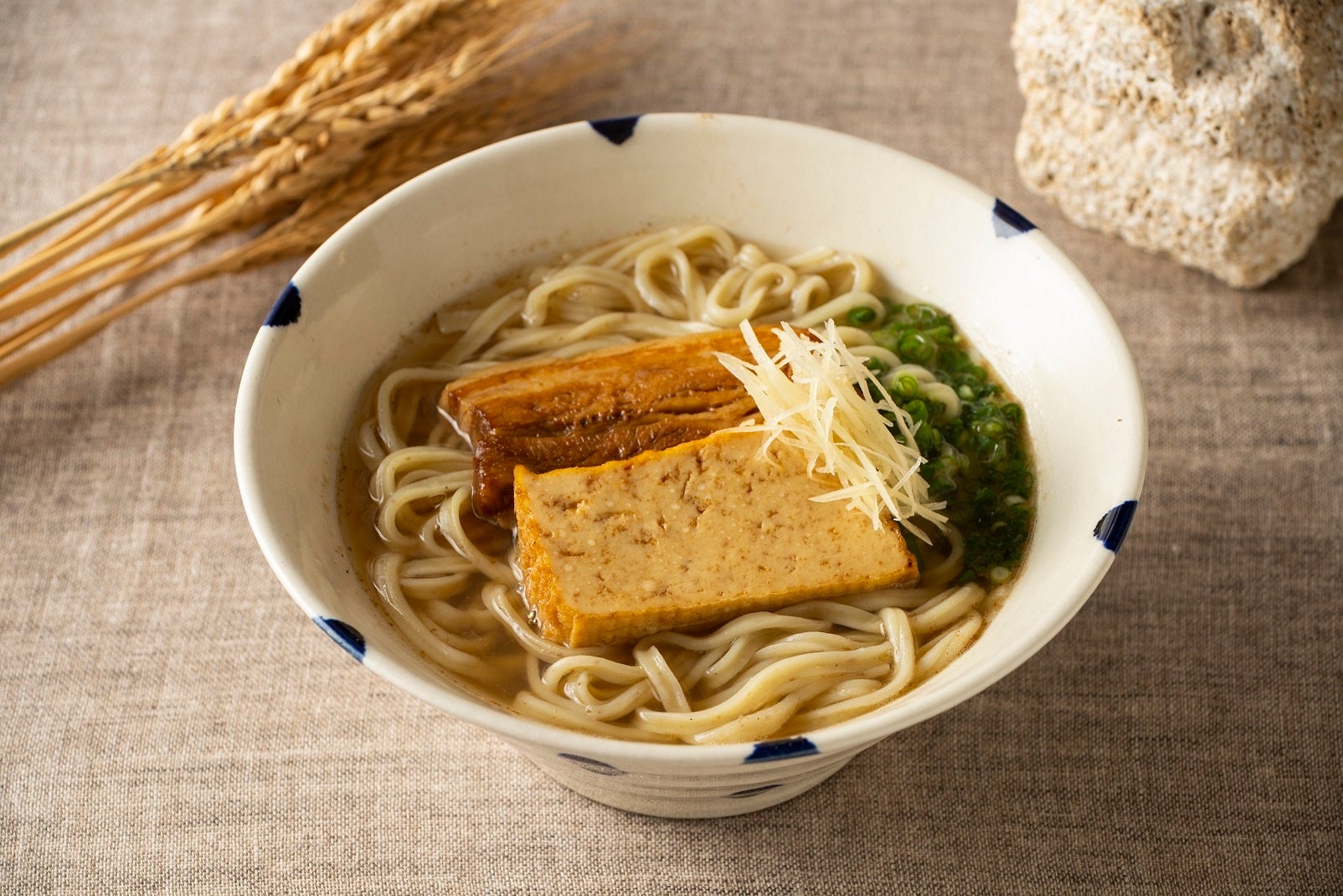 麺に使う小麦から器まで、全て沖縄で生まれたものにこだわるお店。器は気鋭のやちむん作家「陶器工房壹」に特注した水玉そばマカイを使用しています。スープは化学調味料を使わず、8種の魚節と昆布、椎茸から低温抽出した出汁に自家製の醤油ダレを効かせて。