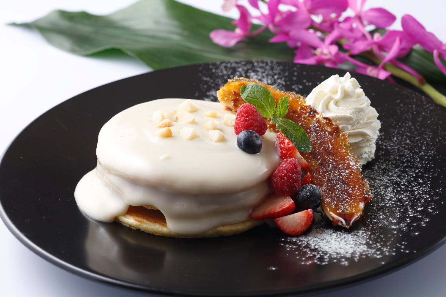 さらに、ハワイアン気分を盛り上げるアイテムとして、極上のハワイアンカクテルをご用意いたしました。トロピカルカクテルの女王マイタイに濃厚なマンゴーを加えた「マンゴーマイタイ」と初夏の時期にピッタリなすっきりとした味わいの「幕張ジントニック」。食事だけでなくカクテルでもハワイの風を感じみてはいかがでしょうか。また、バーベキューの後のデザートには、パンケーキの上から温かいマカダミアナッツソースをたっぷりとかけた「ハワイアンパンケーキ」(写真・¥2,000)がおすすめです。