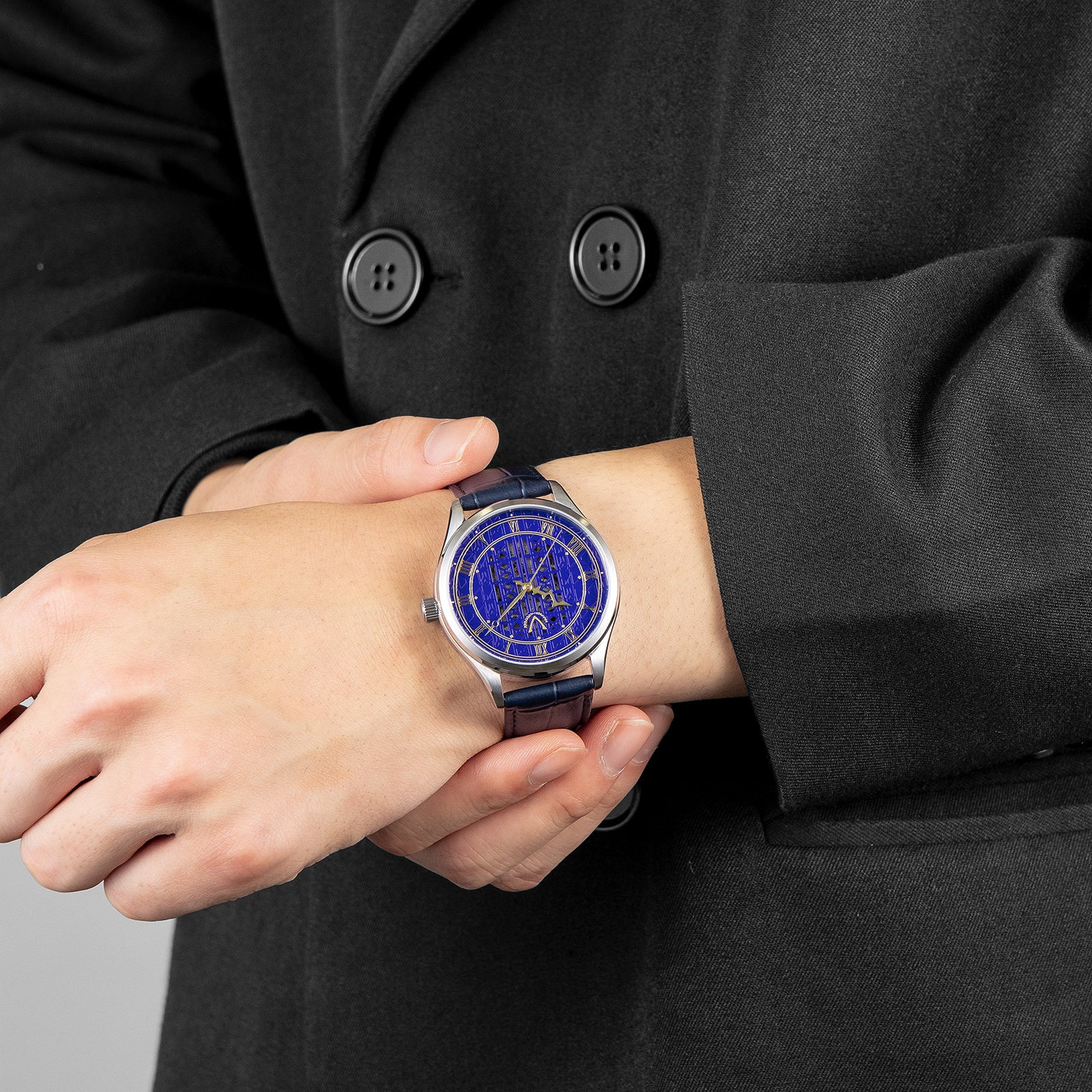 41mmのケースは腕元で程よく腕元に収まりつつ存在感を放つサイズ感。ベルベットルームのイメージカラーを取り入れた文字盤はエレベーターの格子をモチーフにしたスケルトン仕様です。ベルベットルームから着想を得たデザインの時針を採用。時計の心臓部には日本製自動巻きムーブメント(MIYOTA 8N24)を搭載し、高い信頼性を誇ります。防水性能は10気圧防水となっており日常生活における十分な防水性が備わっています。