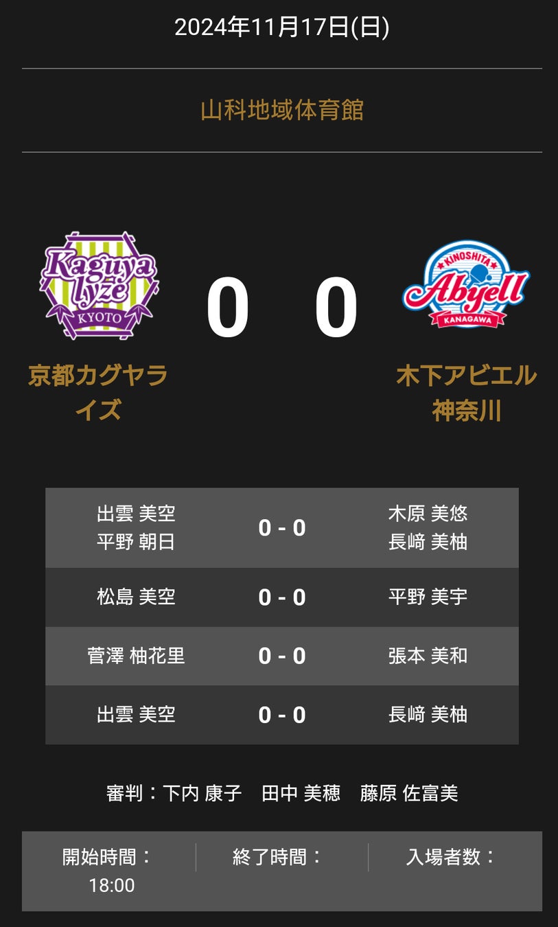 ノジマTリーグ 2024-2025 公式戦 11月17日開催 京都カグヤライズ vs 木下アビエル神奈川 オーダー発表