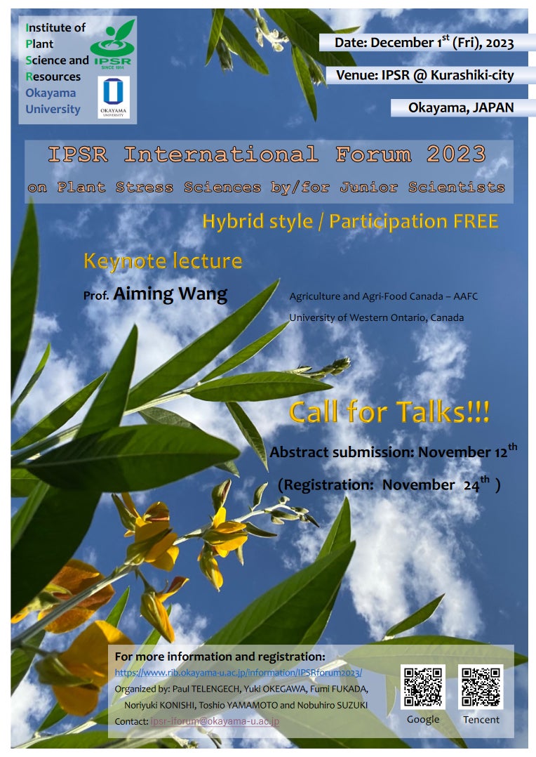 【岡山大学】岡山大学資源植物科学研究所「若手研究者による植物ストレス科学国際フォーラムIPSR 2023」〔12/1,金 ハイブリッド開催〕