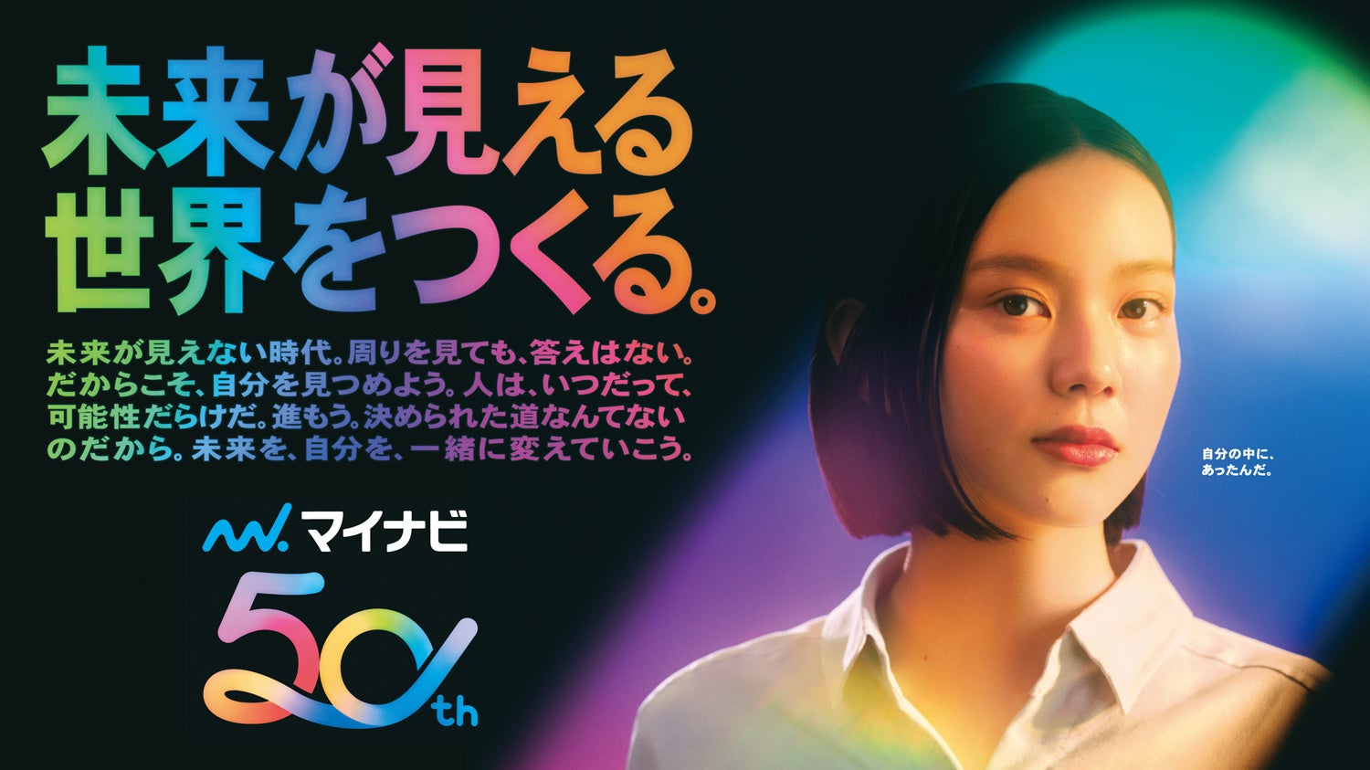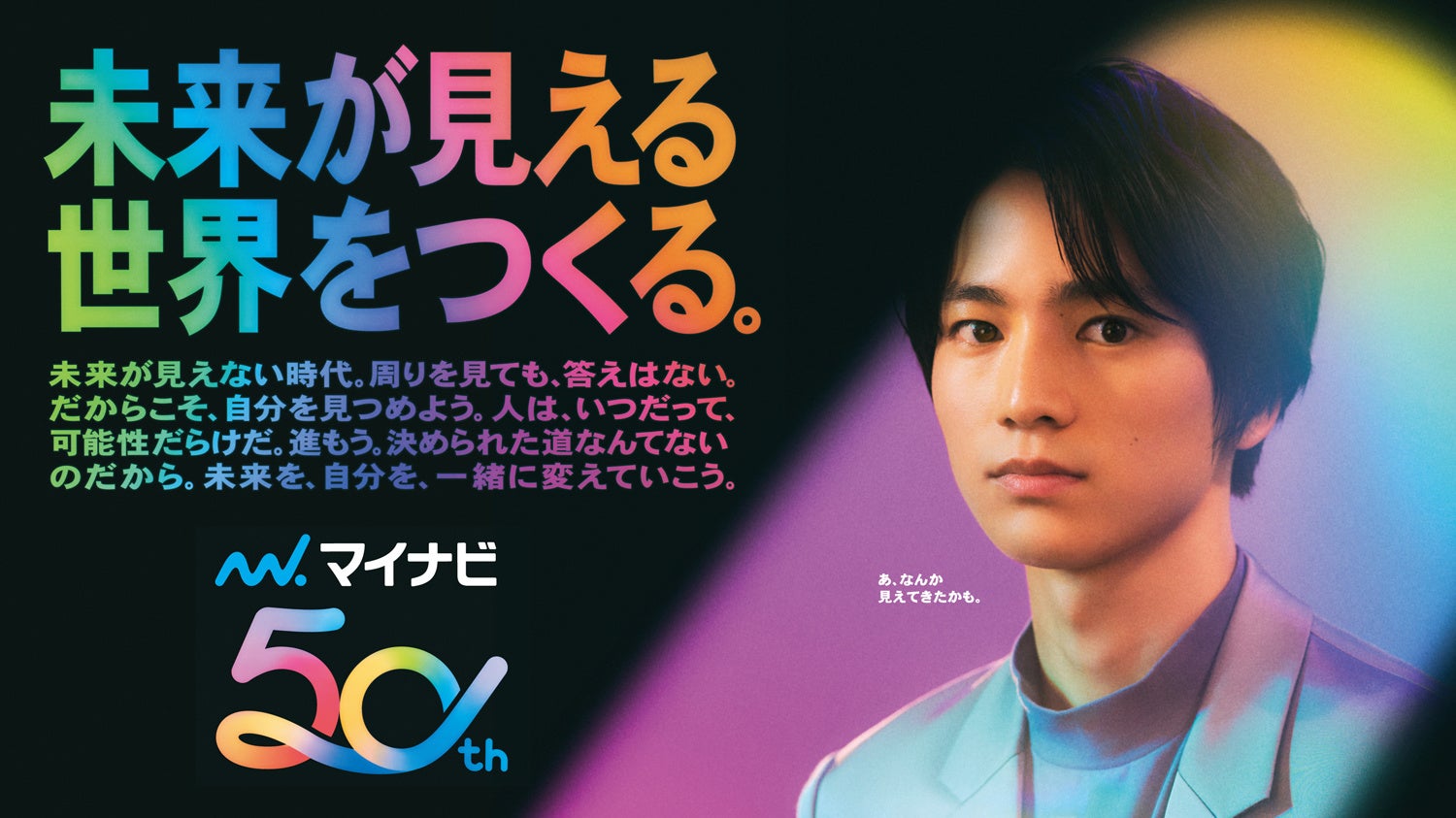 新TVCM「未来が見える世界をつくる。」篇は、50周年を迎えたマイナビのパーパスである「一人ひとりの可能性と向き合い、未来が見える世界をつくる。」という想いを映像化しています。