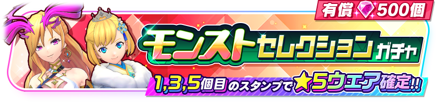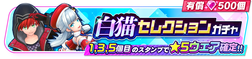 それぞれ★5ウェアが『モンスターストライク』(以下、『モンスト』)の2キャラクターのみ、『白猫プロジェクト NEW WORLD'S』(以下、『白猫』)の2キャラクターのみが登場するガチャが開催予定です。本ガチャは有償ジュエル500個限定で5回までまわすことができ、1回目、3回目、5回目のスタンプでは★5ウェアが確定となります。『モンスト』からはルシファー(CV:荻野葉月)、アーサー(CV:秋山絵理)の2人が、『白猫』からは赤髪のヒーロー(CV:梶裕貴)、アイリス(CV:堀江由衣)の2人が登場します。それぞれのキャラクターは限定ウェアも登場します。