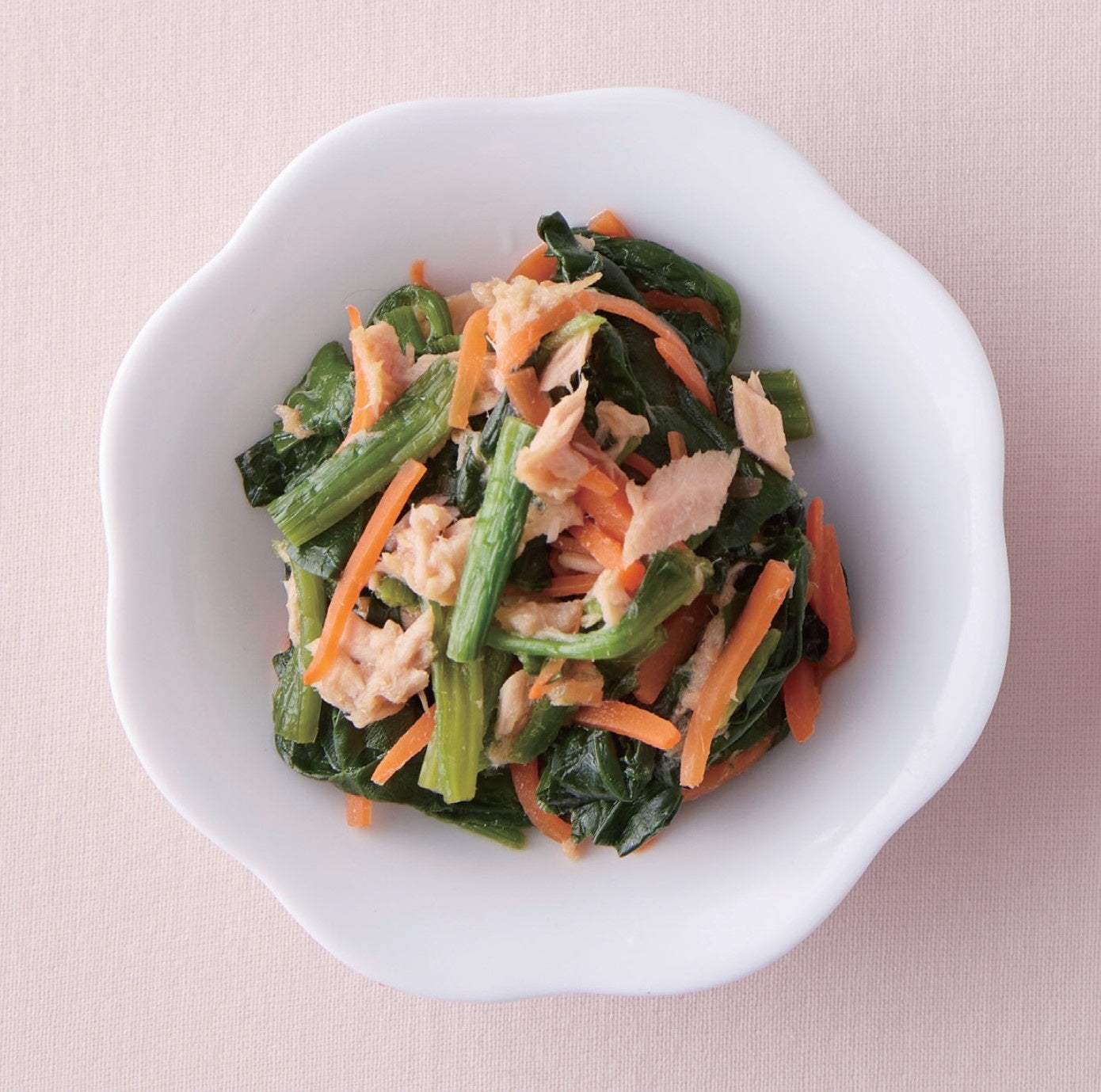 5.ボウルに水気をしぼったほうれん草、にんじん、ツナ、4を入れて和える。