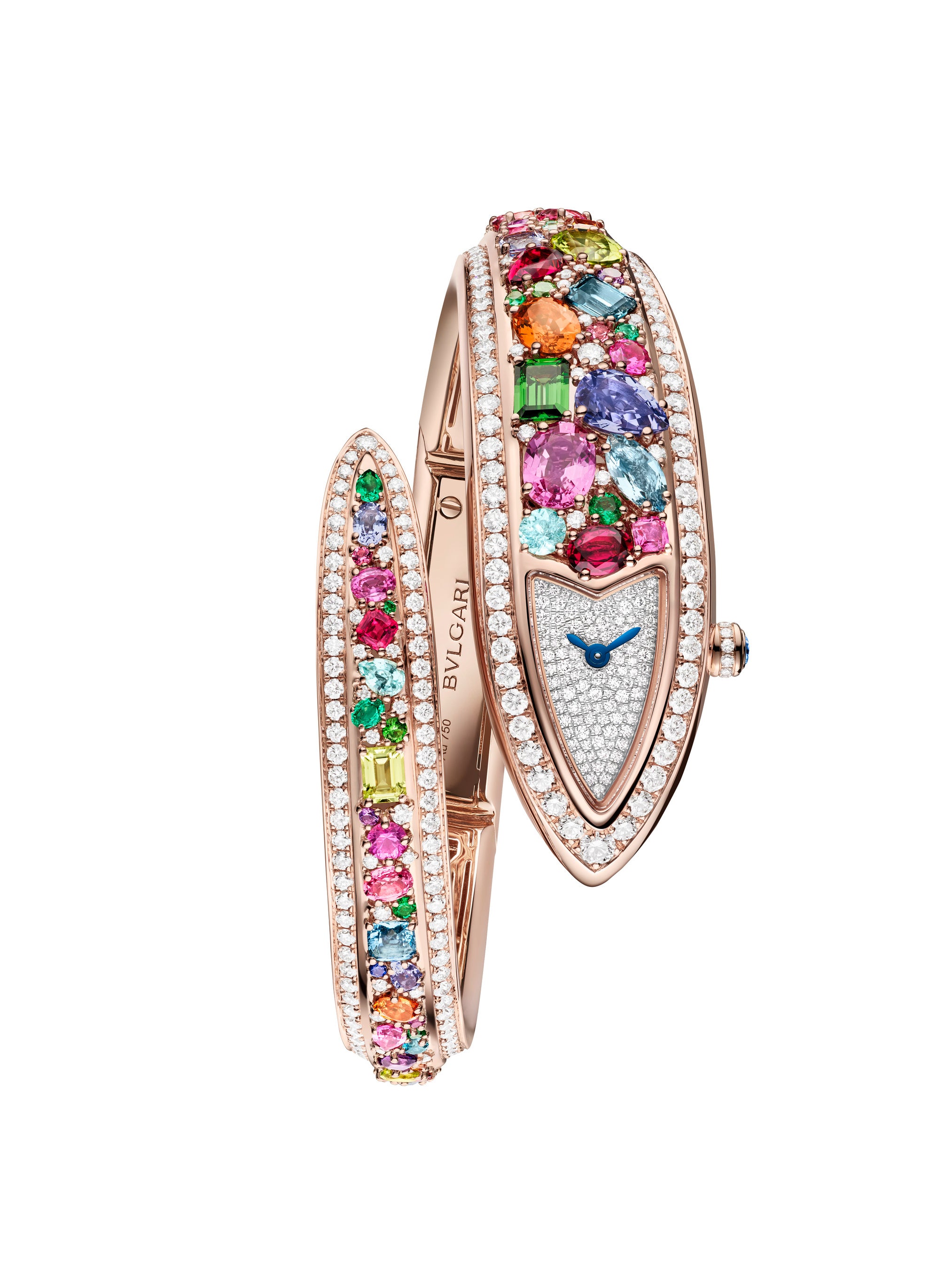 「セルペンティ エテルナ」は、ブルガリのサヴォアフェールを通じ、新たな次元の構造ならびにフォルムへと足を踏み入れます。ルベライト、アメシスト、トパーズ、エメラルド、シトリン、サファイア、タンザナイト、 トルマリン、ツァボライト、ペリドットといった希少な色石122石が厳選されています。ラウンド、ブリリアント、プリンセス、ペア、オーバルといった様々なカットとサイジングを経て、ひとつひとつの石が、驚異的で完全なる調和を生み出すように配置されています。