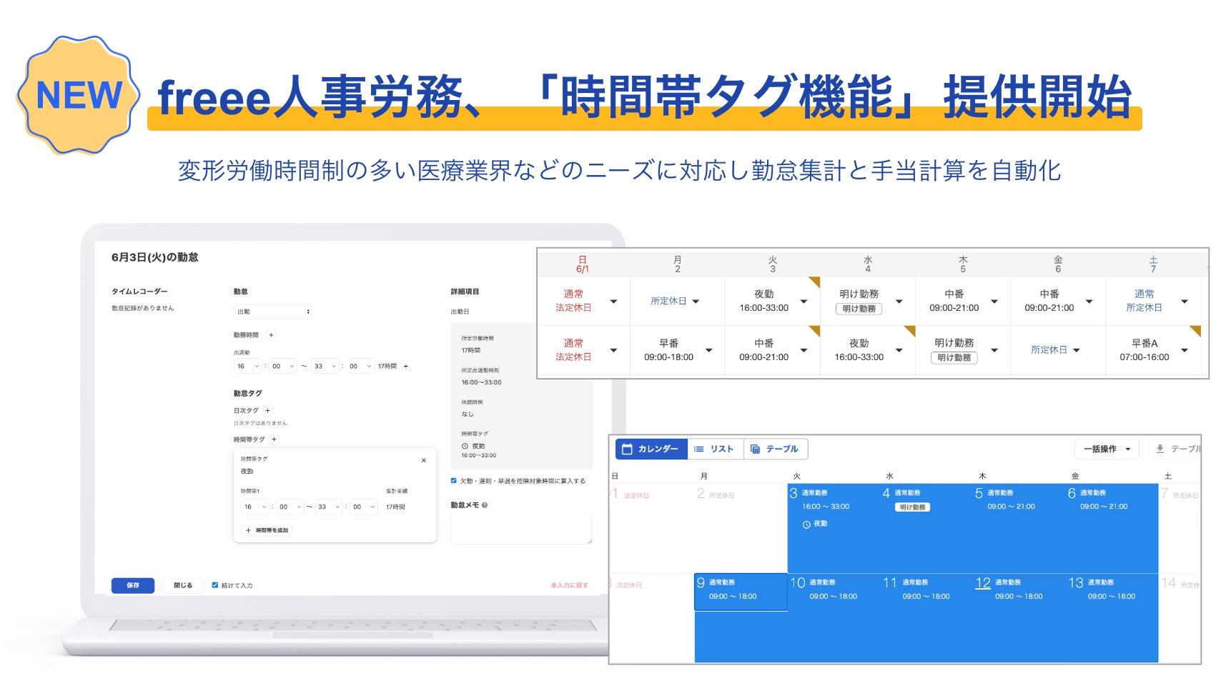 freee人事労務、「時間帯タグ機能」の提供を開始 変形労働時間制の多い医療業界などのニーズに対応し勤怠集計と手当計算を自動化