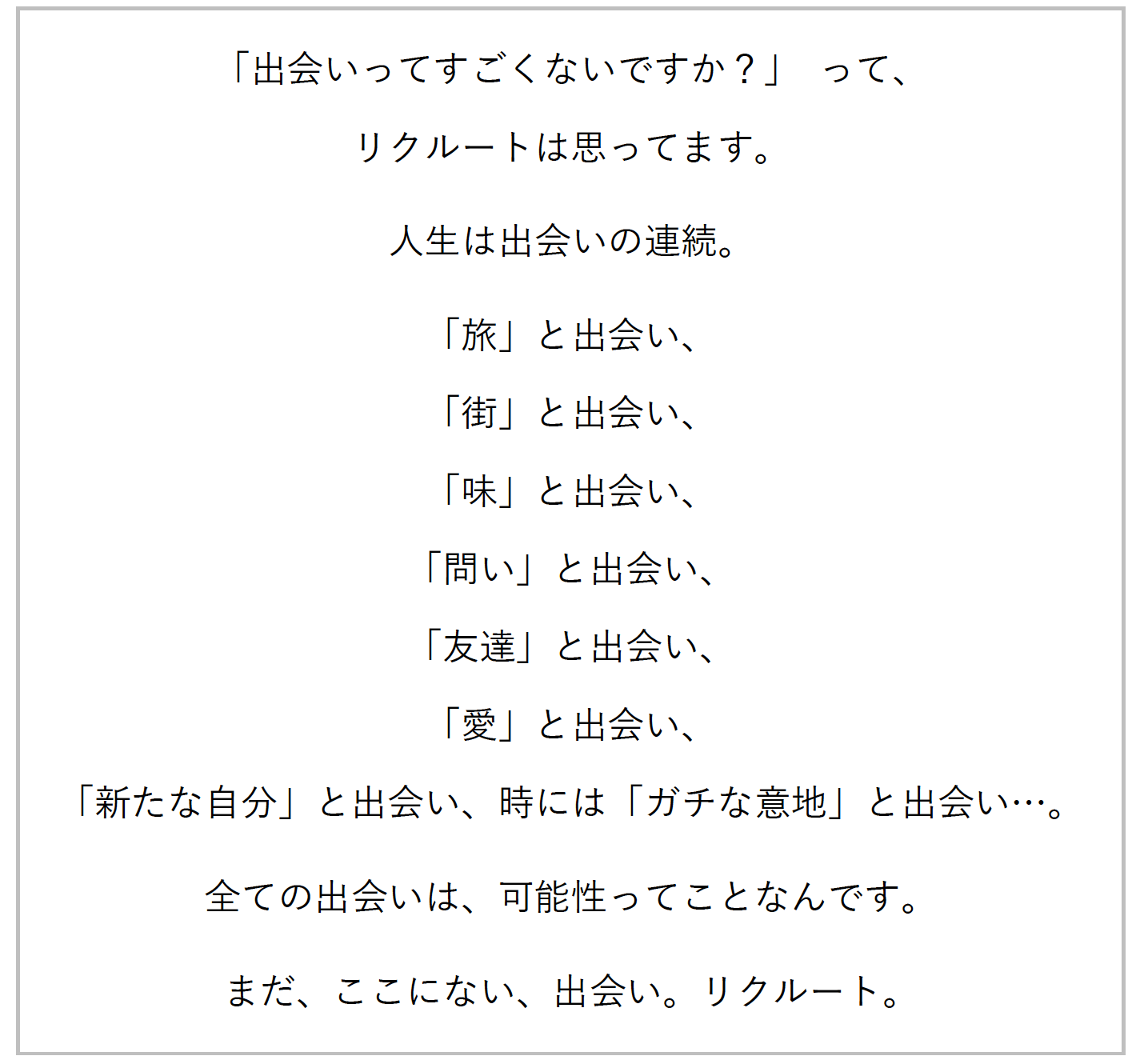 リクルートの強い思いであり事業の根幹である「まだ、ここにない、出会い。」の下、本作に触れた皆さんの新たな一歩を踏み出す後押しになればとの思いで制作しました。