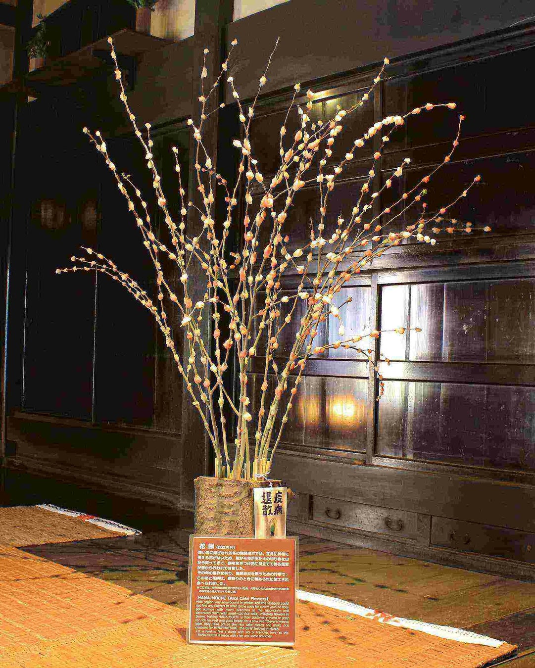 原三溪の故郷、岐阜県から移築した合掌造りの旧矢箆原家住宅では、飛騨地方に伝わるその年の豊作を祈り無病息災を願うための花餅を飾ります。