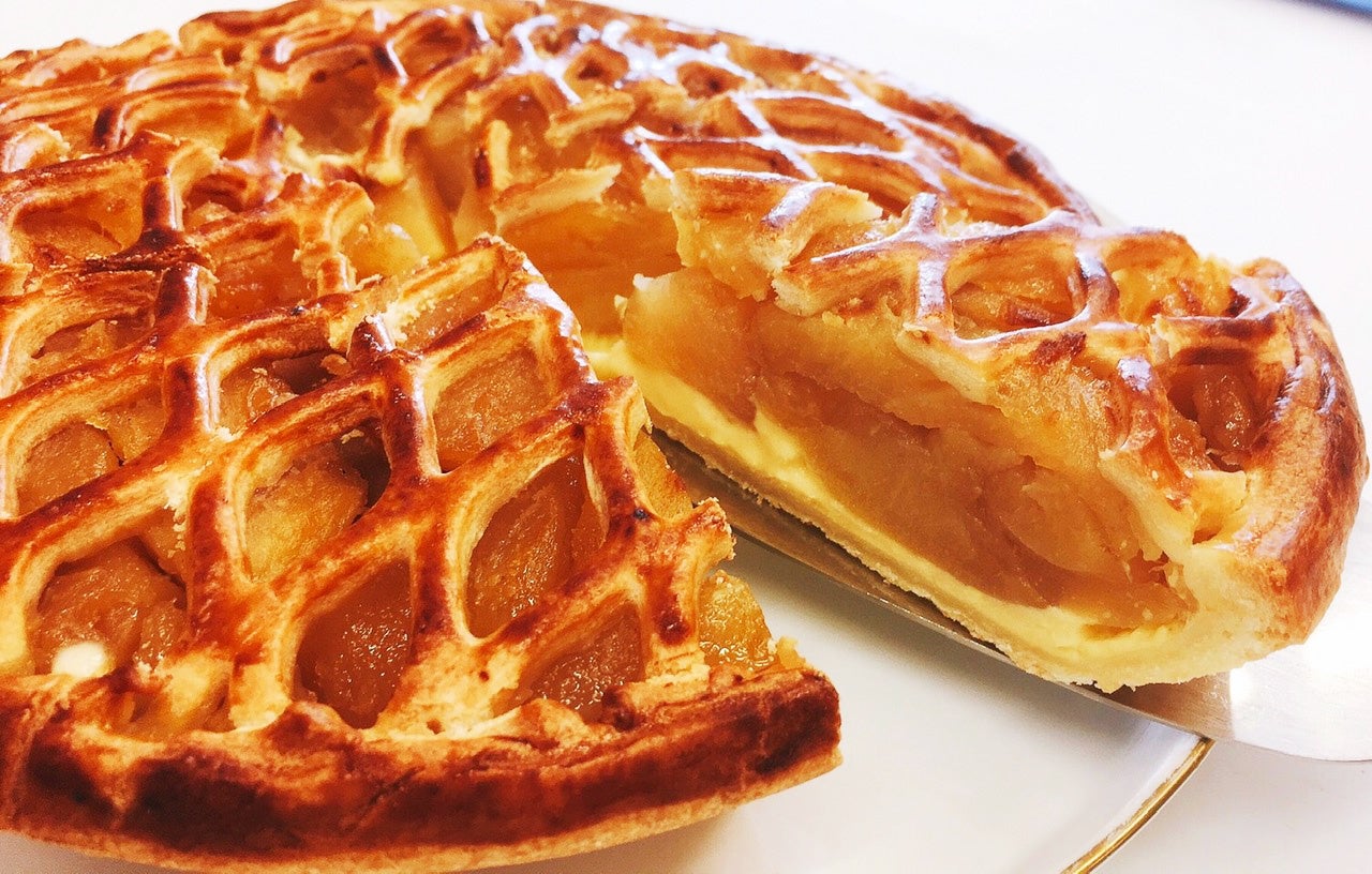 看板商品“カスタードクリームのアップルパイ”は、生のりんごから作るアップルフィリングと自家製カスタードをオリジナルの練りパイで包んだ自慢の一品。