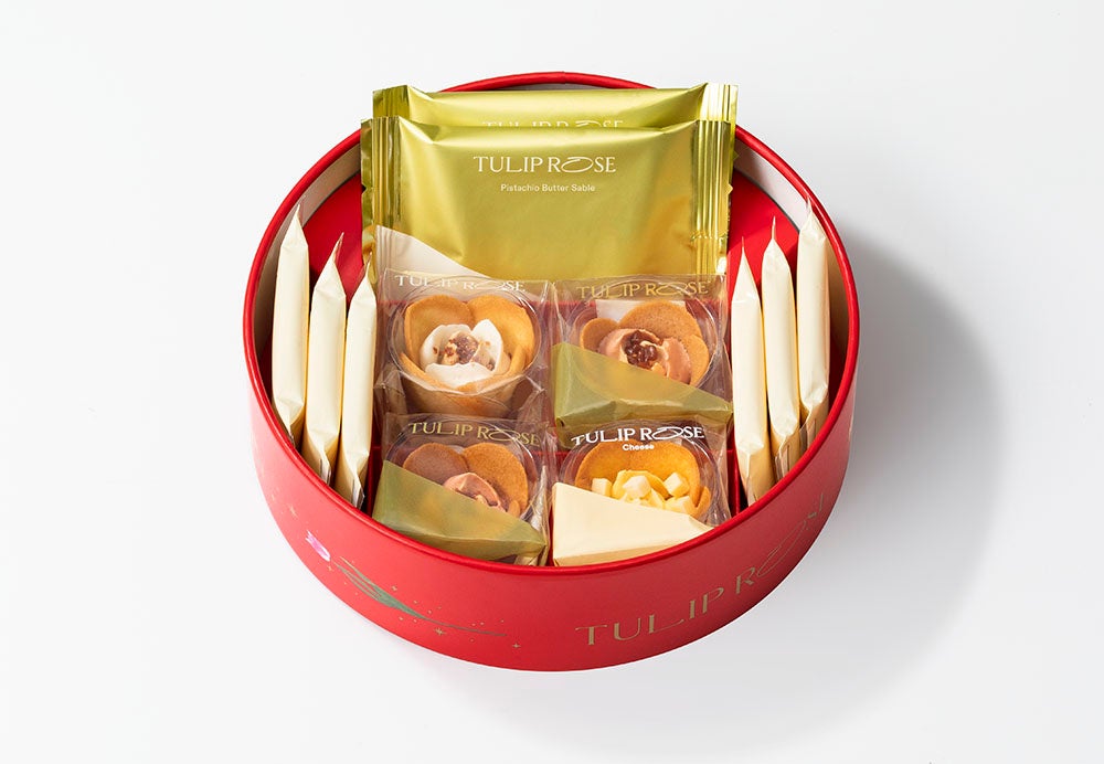 甘く香るフラワーガーデンを贈る、真っ赤なホリデーボックスです。代表作『チューリップローズ』からは、定番“バター”“チーズ”に加え冬季限定“アップルバターキャラメル”。溢れ出したチーズショコラを頬張る“グランチーズショコラサンド”に、ピスタチオが芳醇に香る“ピスタチオバターサブレ”まで。華やかなクリスマスシーズンにぴったりなスイーツ5種を、花束のように詰合せました。1年頑張った自分へのご褒美に、大切な人へのクリスマスプレゼントとしても。年に1度のクリスマスを思う存分お楽しみください。