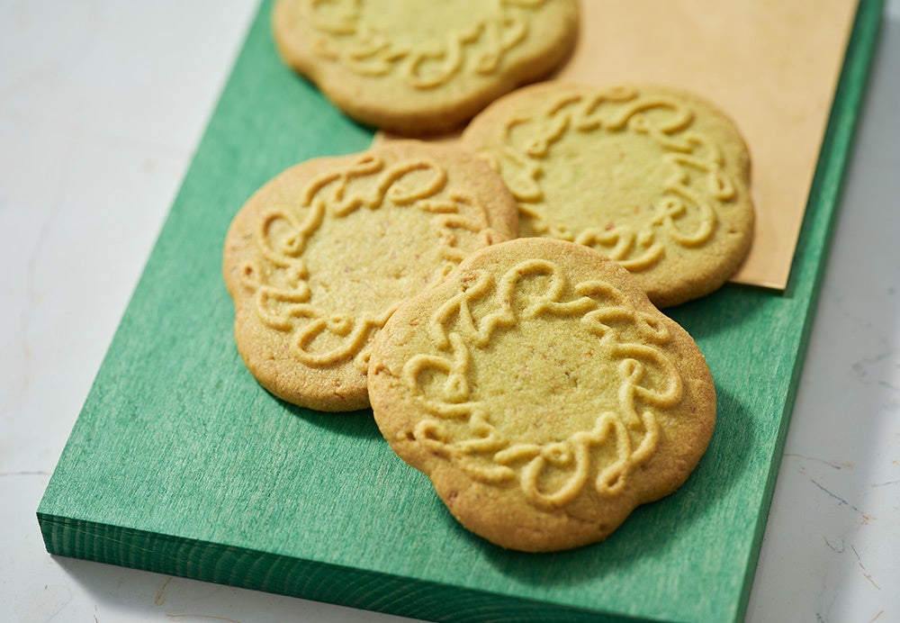 花に⾹ばしく寄り添うグリーンピスタチオサブレです。ローストピスタチオの刻みを練り込んで、芳醇な香りを閉じ込めました。