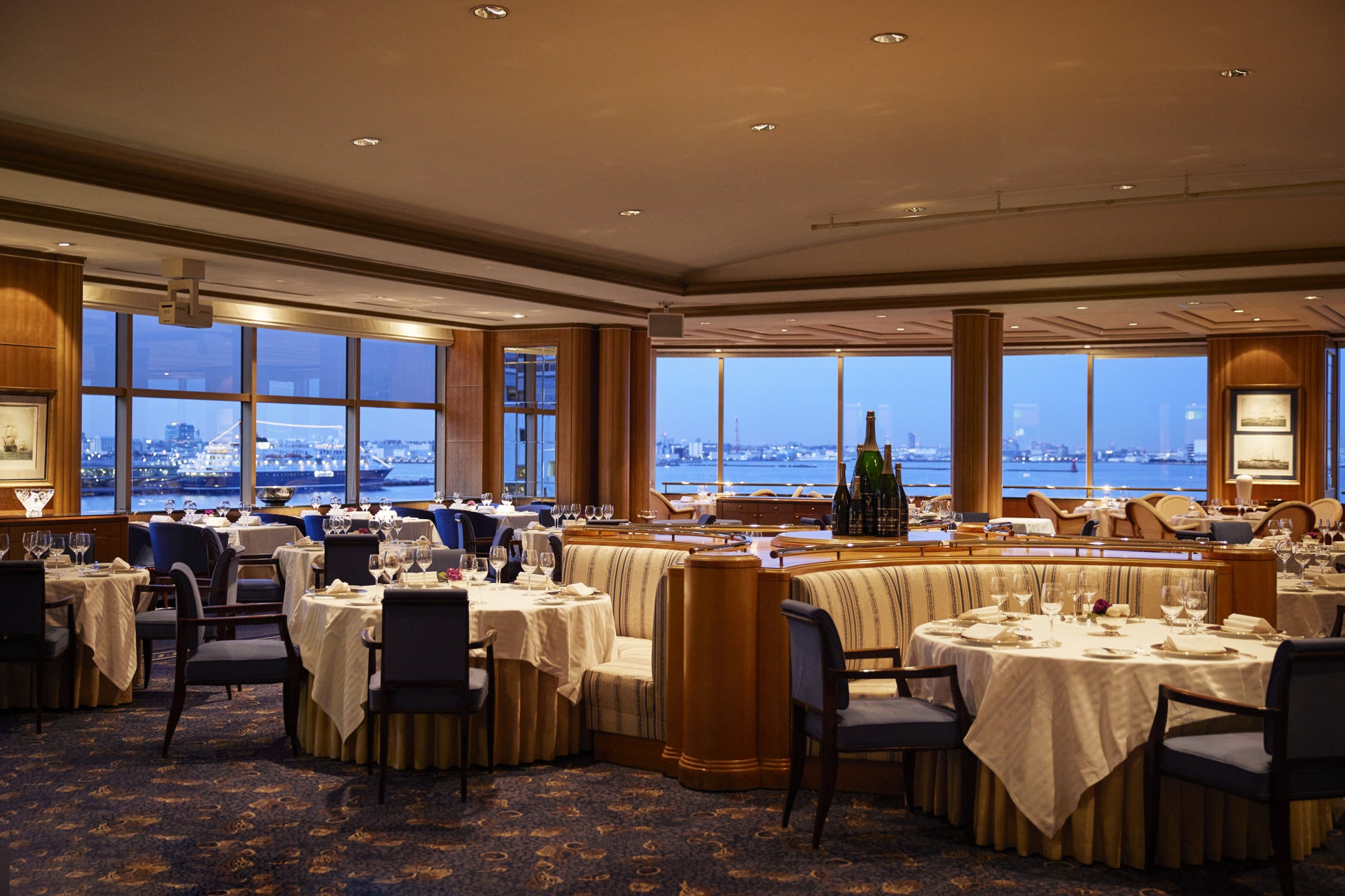 実在したフランスの豪華客船ノルマンディー号をコンセプトにした店内からは横浜港の景色を一望いただけます。日没とともに街の灯りが煌めきはじめ、夜は宝石のようにまばゆい景色が広がります。