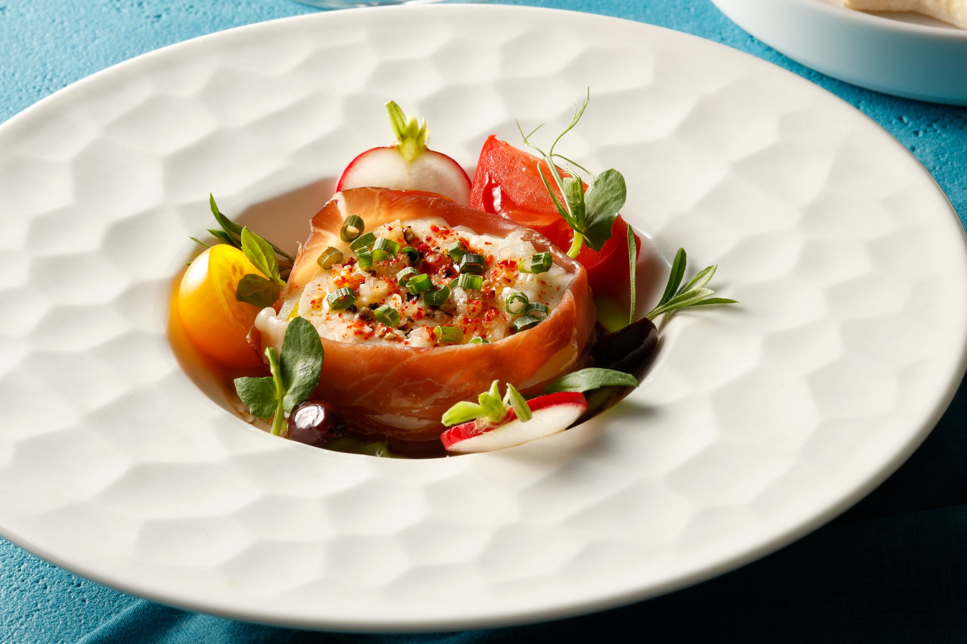 夏の訪れとともに爽やかな味わいをお楽しみいただけるようにと、ル・ノルマンディ料理長 花木洋一郎がそれぞれの料理にワインをペアリングし、チーズの旨味とワインの魅力を最大限に引き出すよう仕上げた極上の品々をご提供します。とろけるような食感のブラッティーナチーズに芳醇な旨味の生ハムとバジル風味のズッキーニソースを合わせた夏の香りを味わう前菜や、香ばしく焼き上げたチーズクルートを纏わせた魚料理は、表面はカリッと、中はふっくらと仕上げ、魚の繊細な味わいに爽やかな酸味のあるソースを合わせた夏らしい一皿です。日没の夕焼けや煌めく夜景など、刻々と変化する横浜港の美しい景色とともに、ワインとチーズが織りなす贅沢なマリアージュをご堪能ください。
