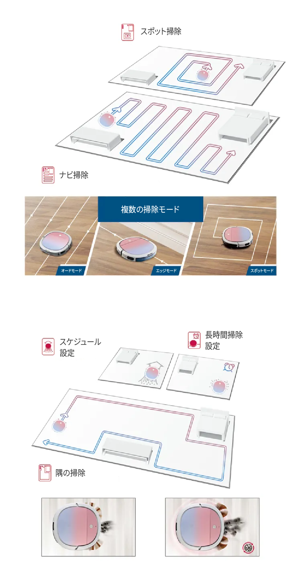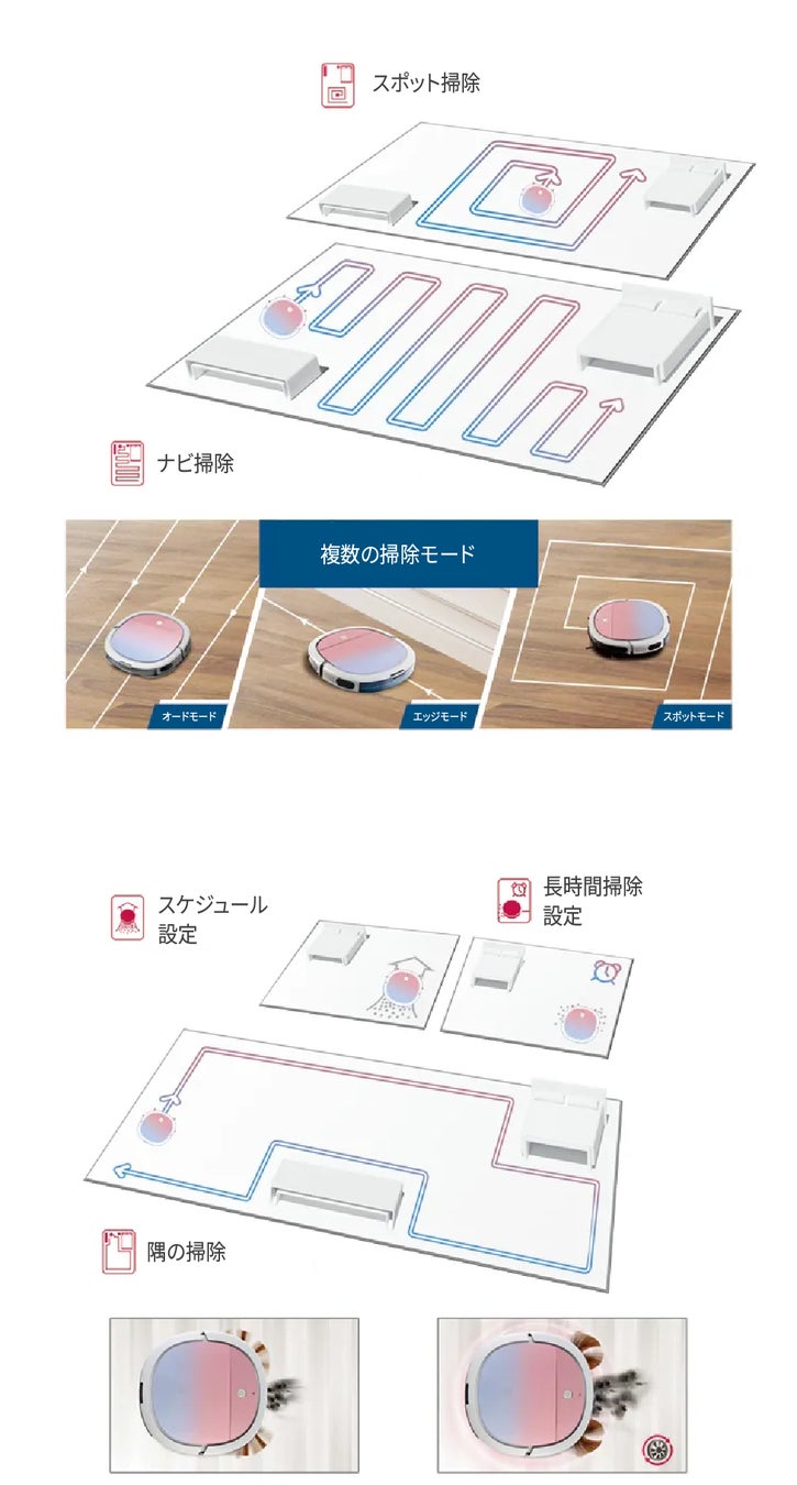ご自身に合わせて、掃除モードが選べます。タイマー設定は、出かける際に必要な方にもおすすめです。