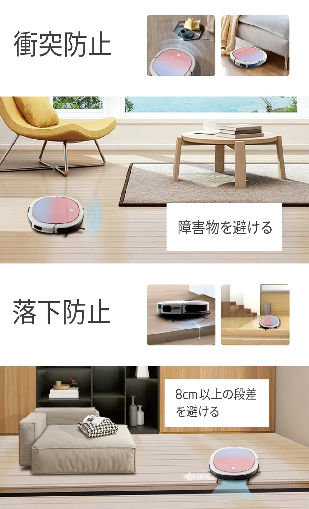 高い段差や障害物を感知して避けてくれるため、落下の心配がなく安心してご使用いただけます。
