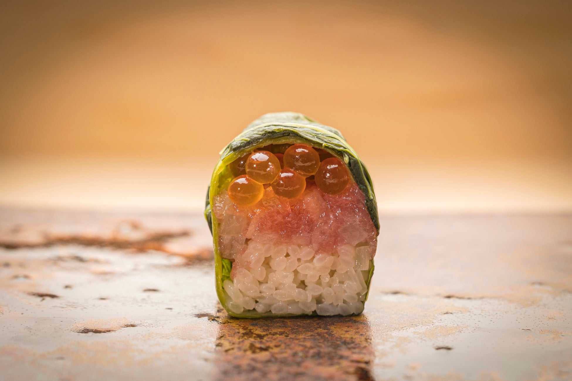 「握り」には、「漬け」や「酢締め」といった伝統的な江戸前鮨の技法を駆使し、魚の旨味を引き出す、江戸前の粋を表現します。鮨種は、東京近郊のみならず全国各地から届く旬の魚介を厳選します。また、日本各地の鮨文化から着想を得た、独創的な握りを楽しめるのもコースの大きな特徴です。例えば、高菜やひじきを白米で握り、高菜の葉で包んだ和歌山の郷土料理「目張寿司」は、刻んだ鮪トロ、らっきょう、いくらと酢飯を層状に重ねて高菜の葉で包むという、遊び心溢れるアレンジを加えました。東京の地で、日本各地の個性豊かな鮨文化を楽しむことができます。
