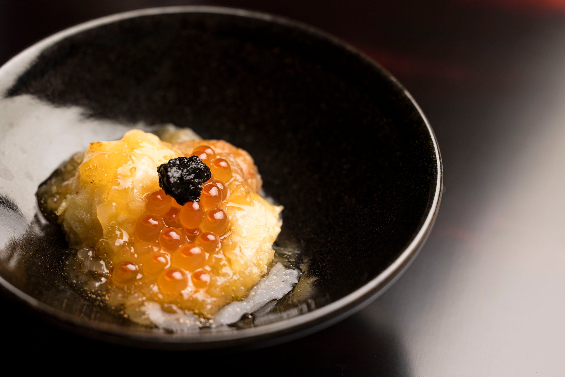 料理長は、日本料理の道を追求し研鑽を重ねてきました。料理旅館や日本料理店で培った技術と知識を活かした「酒肴」は、懐石の流れを汲み、先付けから始まる構成です。一品ごとに味付けの抑揚をつけて提供されます。秋の献立では、身が引き締まった戻り鰹を、かつらむきのように薄く剥いた大根の酢漬けと錦糸卵で巻いた「鰹の巻物」や、旬を迎える「伊勢海老と無花果の揚げ出し」など、日本の四季を繊細に映しだす逸品の数々が、握りへの期待を高めます。