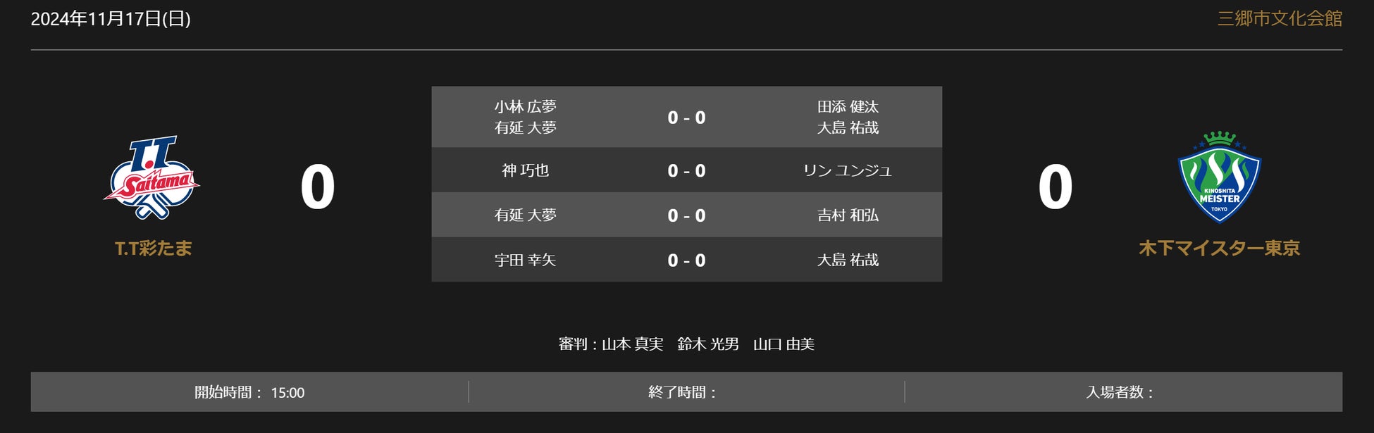 ノジマTリーグ 2024-2025シーズン 公式戦 11月17日開催 T.T彩たま vs 木下マイスター東京の対戦オーダーを発表いたします。