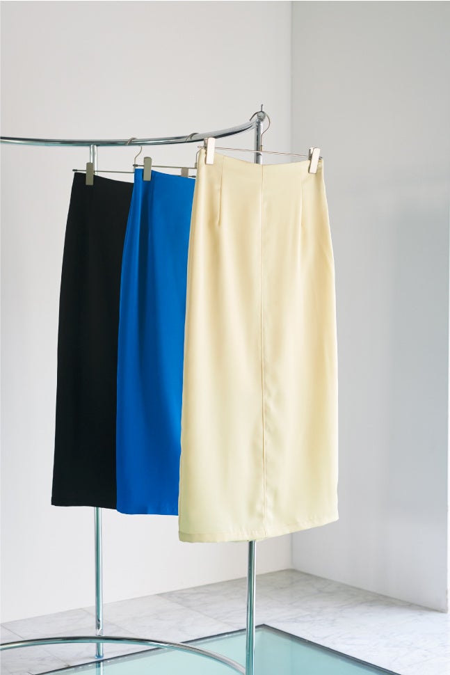 歩くたびにヘルシーなスリットがのぞき、サテンの艶が揺れるドラマティックなスカート。ストレッチ性のある素材が、美しいIラインと⼼地いい⾜捌きを両⽴します。ニットやシャツなど、合わせるトップスによってスカートの表情は豊かに変化。