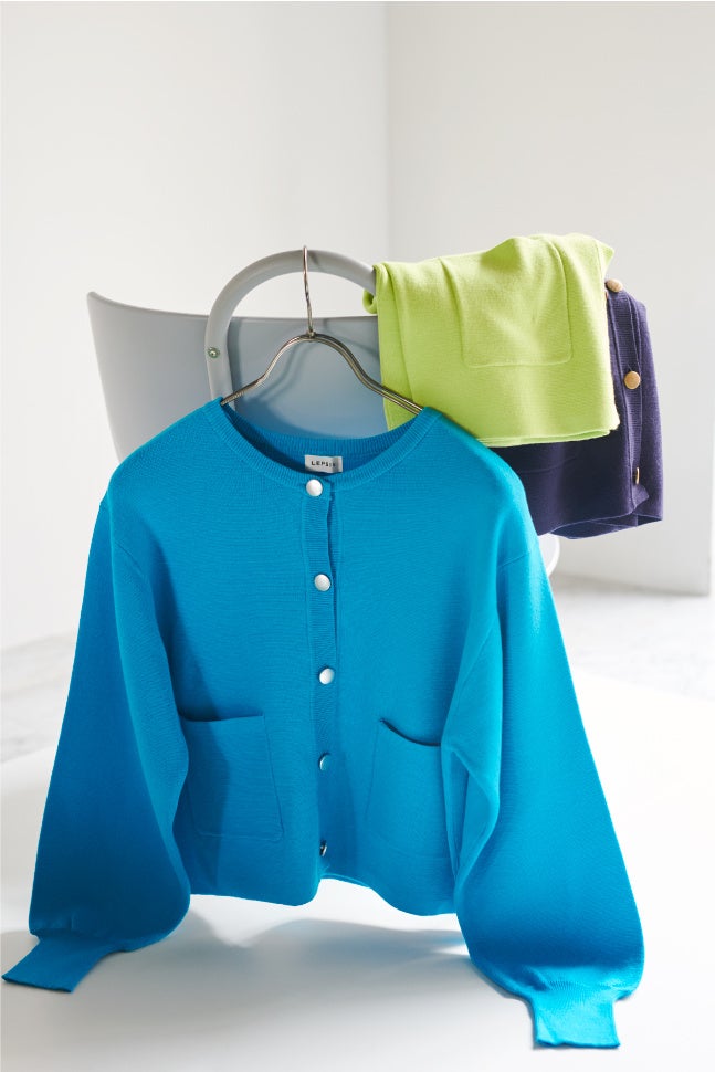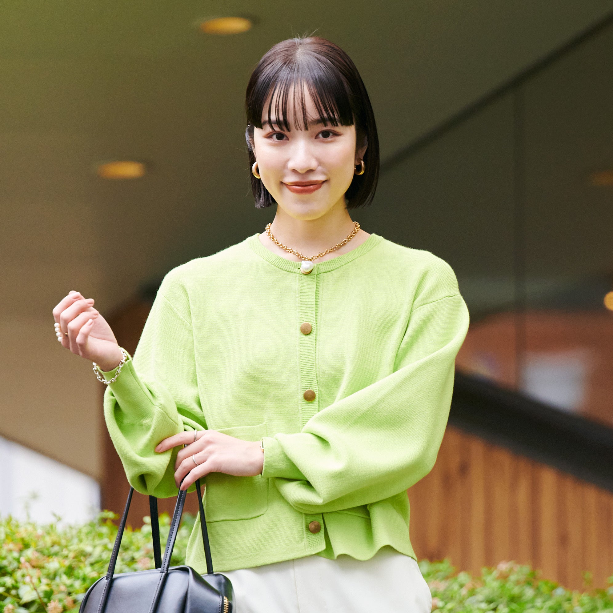 ハリ感があり、もっちり肉厚なカーディガンは、“ジャケット見え”が叶う1着。艶消しのメタルボタンが品の良さをさらに後押しします。袖をまくれば、ポワンとボリュームあるシルエットに。カジュアルな雰囲気も楽しめる二面性が魅力です。