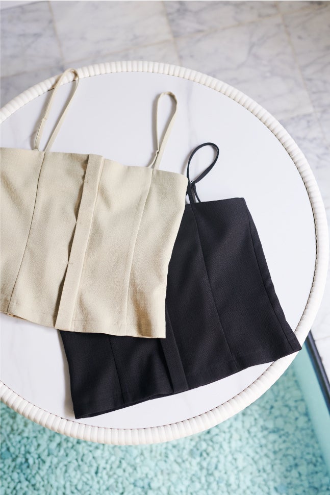 今年⼀推しのトレンド、ビスチェ。シャツに重ねたり、肩ひもを外してワンピースに重ねれば、愛⽤の服が新鮮な印象に。着脱が楽なボタンデザインやバックのギャザー仕様など、⽣地のストレッチ性も後押しし、快適な着⼼地。