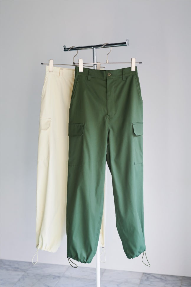 ポケットやウエストにしっかりミリタリー要素を効かせつつもヒップまわりをスッキリ仕上げたことで、カジュアルなアイテムがきれいめに昇華。トレンドのコンパクトなトップスとも好バランスです。裾を絞り、ボリューム感の調整も可能。