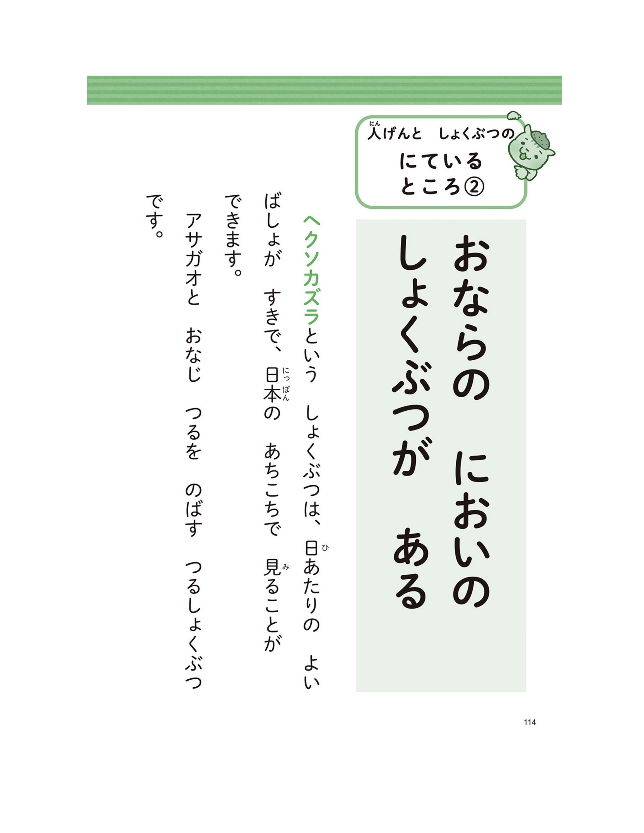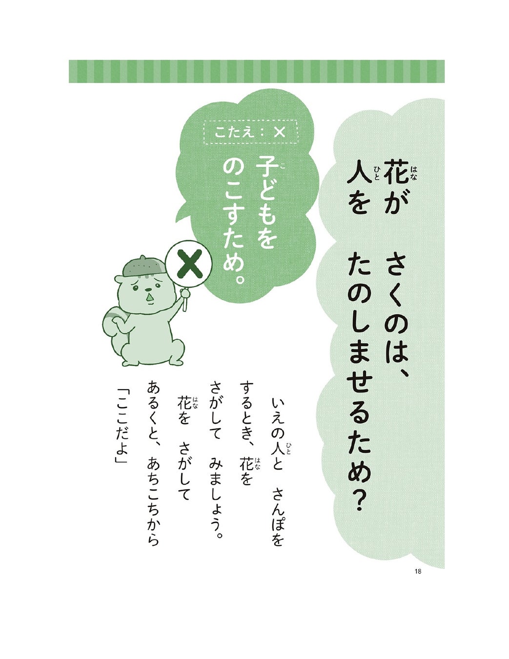 ファーストステップは、花と草に関する◯✕クイズ。親子や子ども同士で出し合って楽しめます。小学校3年生から始まる「理科」の知識も含まれているので、新しい教科にスムーズに進めます。