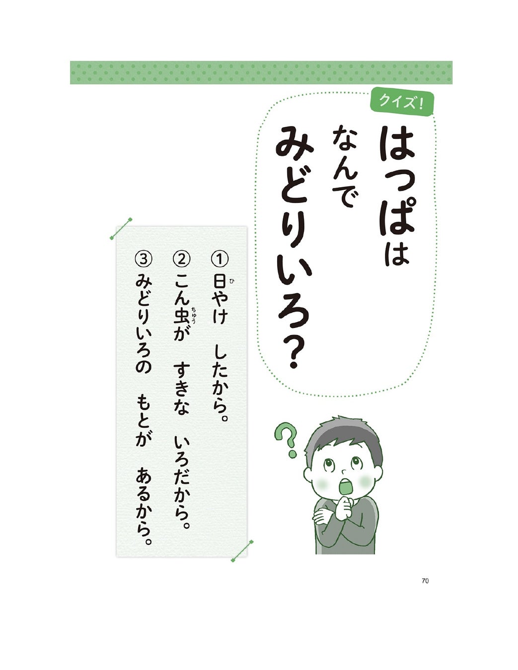 次は3つの中から正しいものを1つ選ぶ3択クイズ。散歩や公園遊びなどで目に入りやすい樹木や葉っぱの「なぜ? どうして?」をまとめました。外出中や家庭内での「話題」としても◯。