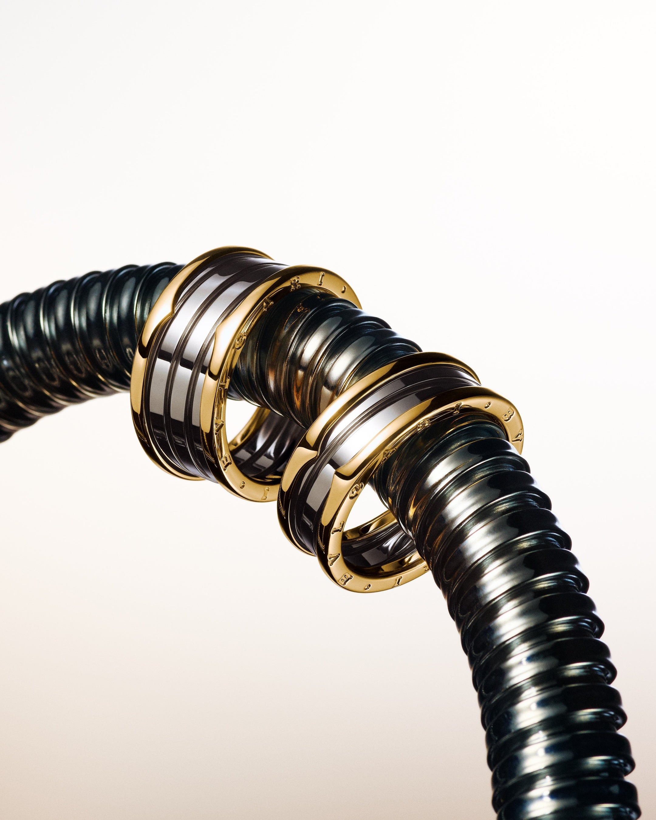 「ゴールド&スティール」を通してブルガリは、1970年代からメゾン独自の先鋭的な表現を象徴してきた、貴重なゴールドとステンレススティールという、最も独創的かつ決定的な創造領域を改めて提示します。この大胆な素材の融合は、軽量性、快適性、そして日常使いのために考案された2連および4連のビー・ゼロワンのリング、ブルガリ トゥボガスのネックレスやブレスレット、印象的なハイジュエリー作品を通じて、新たな表現を見出します。飽くなき探求心、独特の美学、そして巧みな職人技で長年称賛されてきたメゾンの2つの象徴的なコレクションは、この印象的な素材の組み合わせにより、ヘリテージとモダンを繋ぎ続け、常に進化するアイコンとしての地位を再確認しています。