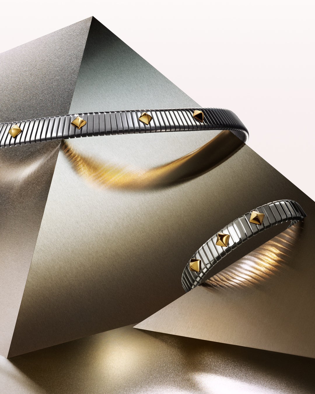 革新的なヴィジョンから生まれたブルガリ トゥボガス コレクションは、産業とジュエリーデザインを融合させたネックレスとブレスレットを発表します。1970年代のブルガリの大胆なデザインを彷彿とさせるこれらの作品は、ステンレススティール製の象徴的な柔軟で継ぎ目のないコイルを特徴としています。イエローゴールドのスタッズが表面にアクセントを加え、深みと洗練されたコントラストの遊びを添えています。ゴールドとスティールはシームレスに融合し、デザインの流れるような動きを高め、大胆な創造性と卓越した職人技が具現化されています。