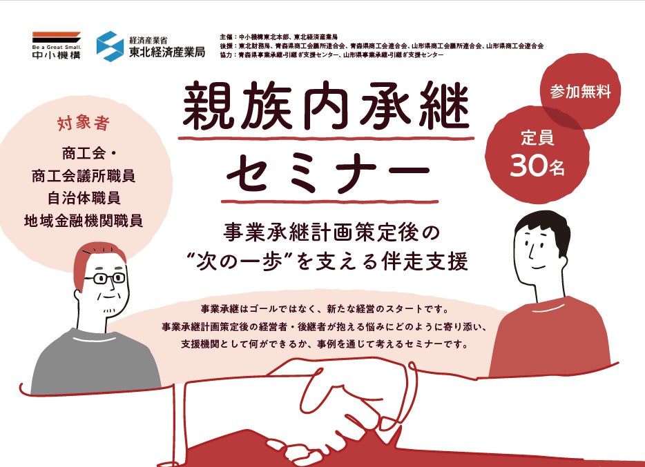 中小機構(独立行政法人中小企業基盤整備機構)東北本部は、「親族内承継セミナー~事業承継計画策定後の“次の一歩”を支える伴走支援~」を、経済産業省東北経済産業局と合同で開催します。セミナーは、12月10日(水曜)に青森県青森市、12月16日(火曜)に山形県山形市で開催します。参加費は無料です。
