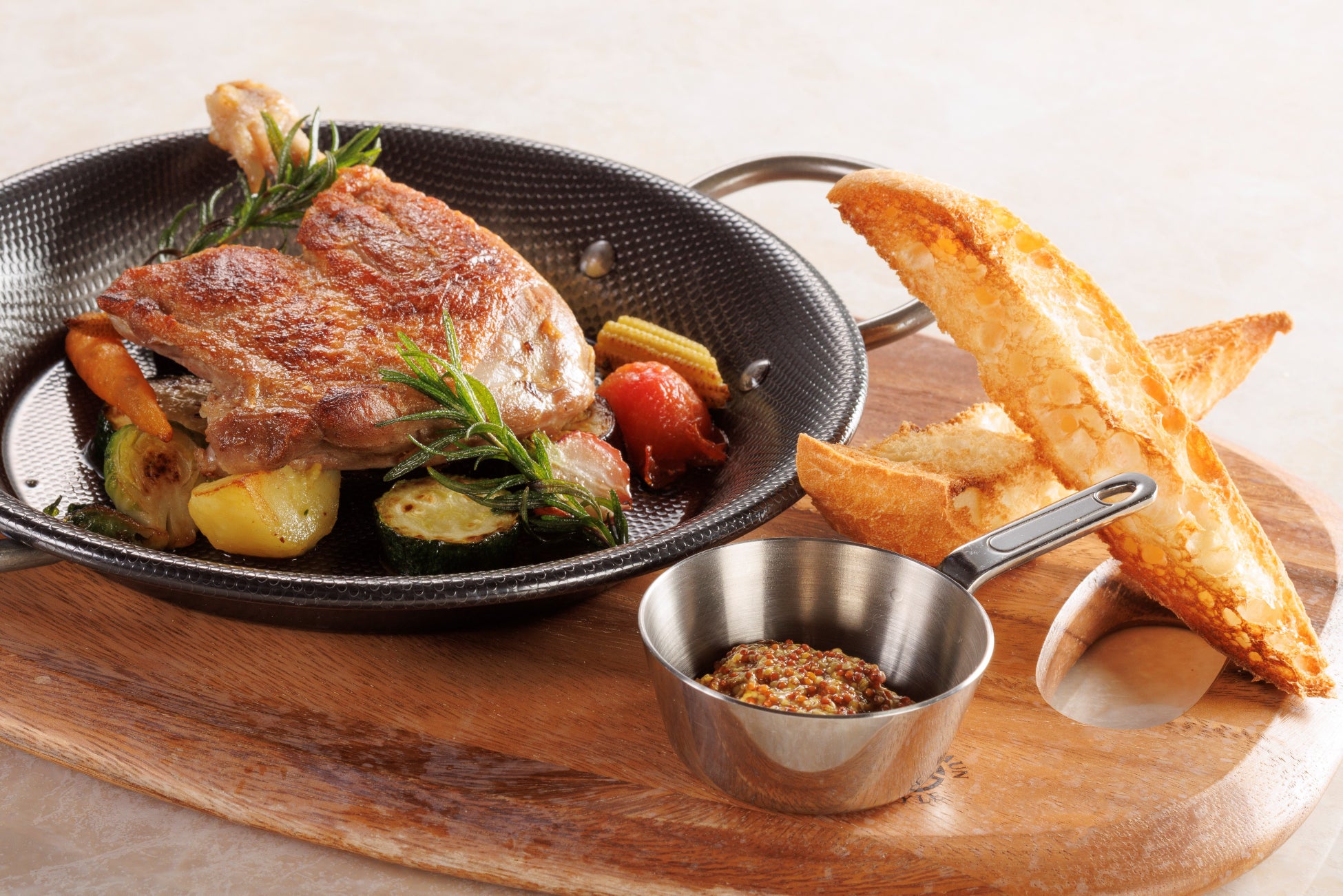 鴨肉を低温の油でじっくり揚げ焼きし、時間をかけて丁寧に仕上げるフランス南西部の伝統料理。ガーリックトーストとともにお召し上がりいただく、ボリュームのある一品です。