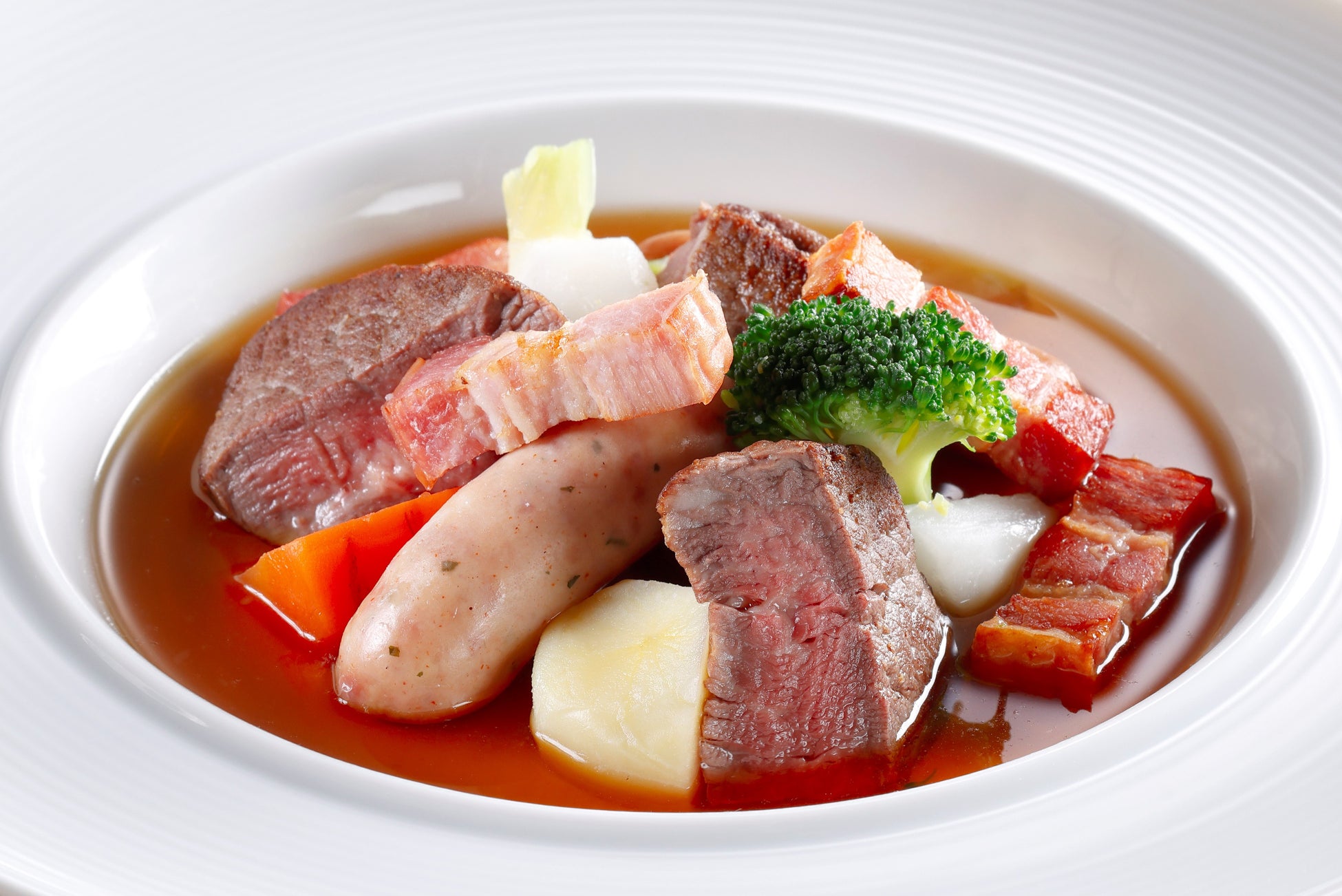 牛肉、野菜などを煮込んで仕上げる、フランスの伝統的な家庭料理。肉の旨みと野菜の甘みがたっぷり染みこんだ、やさしい味わいのポトフです。