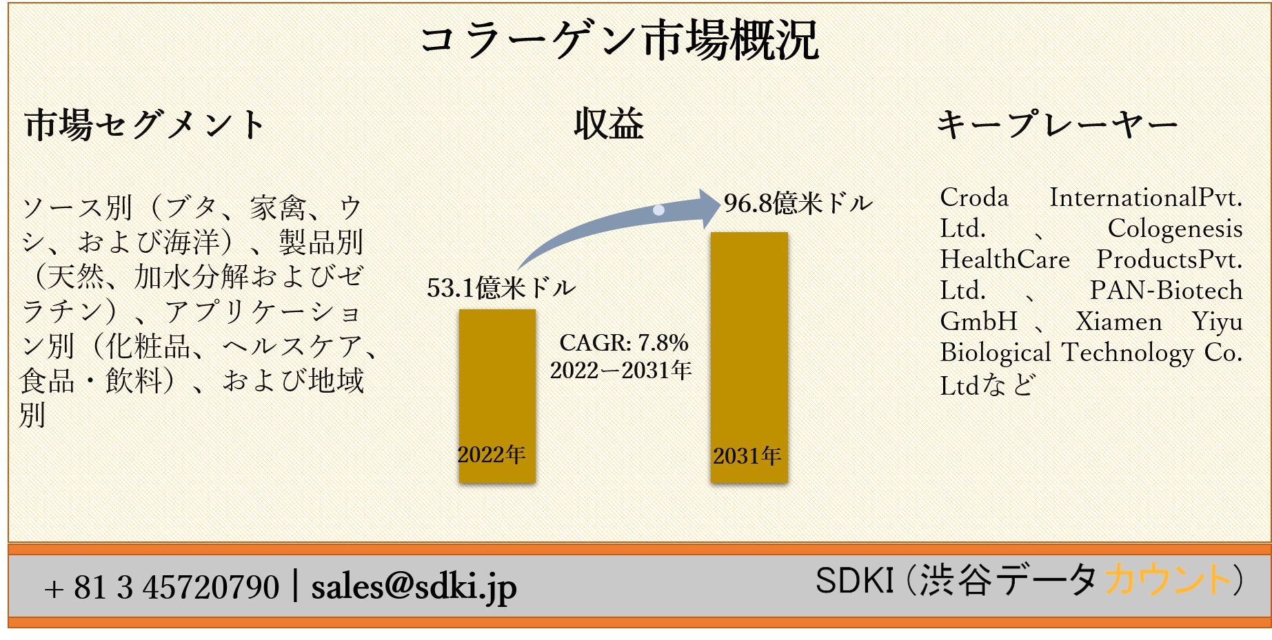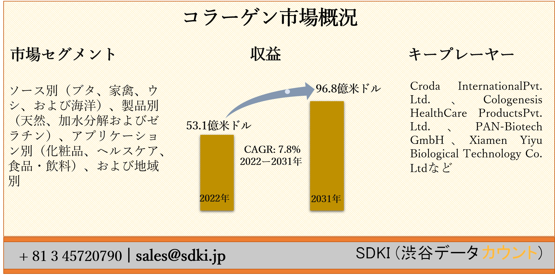 SDKI Inc.は、コラーゲン市場の新レポートを2022年01月25日に発刊しました。この調査には、コラーゲン市場の成長に必要な統計的および分析的アプローチが含まれています。レポートで提供される主要な産業の洞察は、市場の既存のシナリオに関する読者に市場の概要についてのより良いアイデアを提供します。さらに、レポートには、市場の成長に関連する現在および将来の市場動向に関する詳細な議論が含まれています。