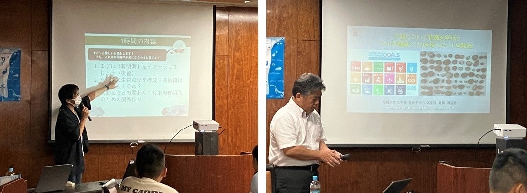 ヘドロ除去については福岡大学教授渡辺亮一先生です。渡辺教授からはアサリの漁獲量が減っていることについて、想定される要因を教えていただきました。①ダム堆砂量の減少②下水道・高度処理の普及③フルボ酸鉄の減少があげられます。中でもフルボ酸鉄は植物プランクトンが育つのに必要なもので、アサリの食料である珪藻類が育つのに必要不可欠です。先生からはフルボ酸鉄シリカを使ったヘドロ抑制の対策について動画を見て効果を教えていただきました。子どもたちからは、自分たちではできないことを可能にする技術の力を目の当たりにし、驚きの声があがっていました。ヘドロが減っていく様子を見て、干潟のヘドロがアサリの成長を邪魔することが分かりました。