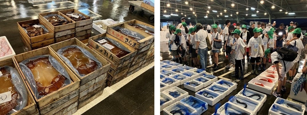 2日目は競りを見学するために、朝4時に起床し、筑後中部魚市場へ。前日に食べた有明海のお魚が並んでいるのを見ることができました。講師に、毎日市場でお魚を買い付けている、地元スーパーまるまつの代表松岡さんにお越しいただき、地元の市場の様子を学びます。