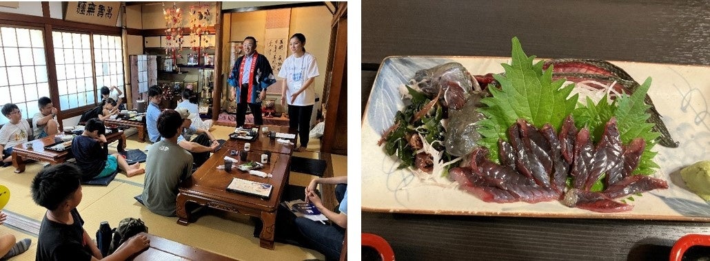 お昼は夜明茶屋で有明海の海の幸をいただきます。柳川にある筑後中部魚市場は、県内三位の取扱高と有明海の珍魚介類の水揚げで、国内随一の魚種の豊かさを誇る一大卸売市場。毎朝、金子社長自ら自分の目で確認し、お魚を卸します。夜明茶屋には韓国、台湾だけでなく、フランスや欧州のお客様も大勢来店され連日満員です。多くのお客様のお目当てはムツゴロウのお刺身!社長は「ムツゴロウ」や「ワラスボ」は柳川の大事な観光資源。若い人たちが食べないと、ムツゴロウが増えても漁師はどんどん減ってしまう。この体験で実際に食べてもらい、食を通して海に関心を持って欲しいとお話がありました。初めてムツゴロウをお刺身で食べた子どもたちからは「美味しい!」「食べられるなんて知らなかった!」という声がありました。